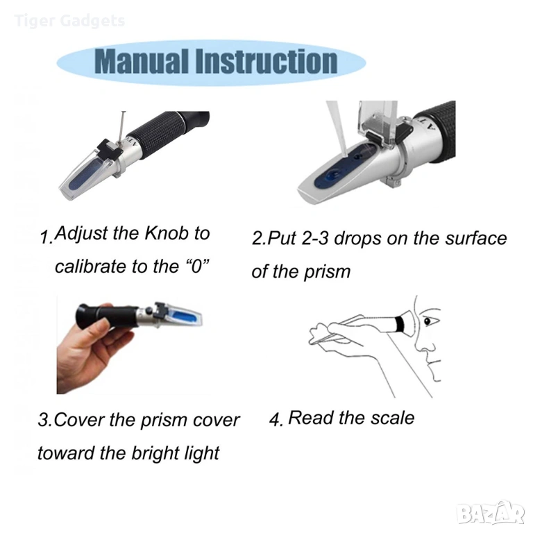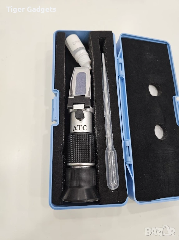 Измерването е лесно – поставят се няколко капки върху призма и резултатът се отчита директно през окуляра. Рефрактометърът не изисква батерии и е подходящ както за професионална, така и за домашна употреба.