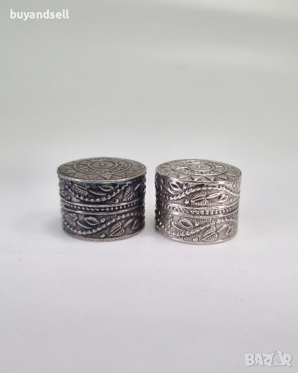 🖇 миниатюрни кутийки - истинско доказателство, че най-ценните неща често идват в най-малки разфасовки. С компактните си размери, те са били предназначени за съхранение на изключително ценни и дребни предмети или вещества. Едната кутийка е със запазена тъмна патина, другата е почистена. Височина 1,5 см / диаметър 2 см.
