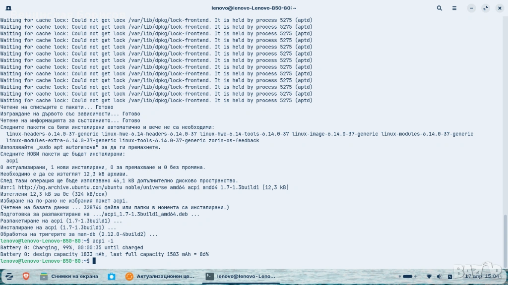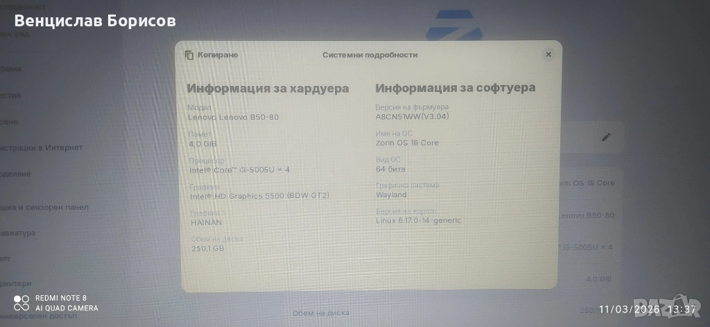 Лаптоп Леново Lenovo B50-80 CPU i3-5005u 4 GB RAM SSD Samsung EVO 860 250 GB Zorin 18 core → Обява 54227348