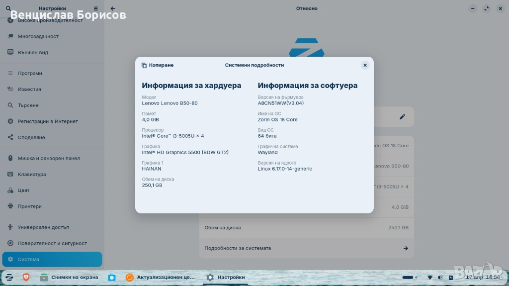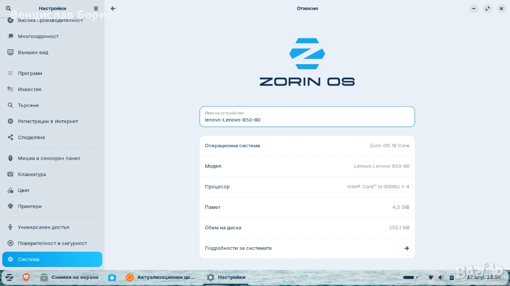 Лаптопа е с OS Zorin 18 core, защото ми беше интересно да видя как изглежда и работи, при ваше желание мога да инсталирам Windows 10 Pro.