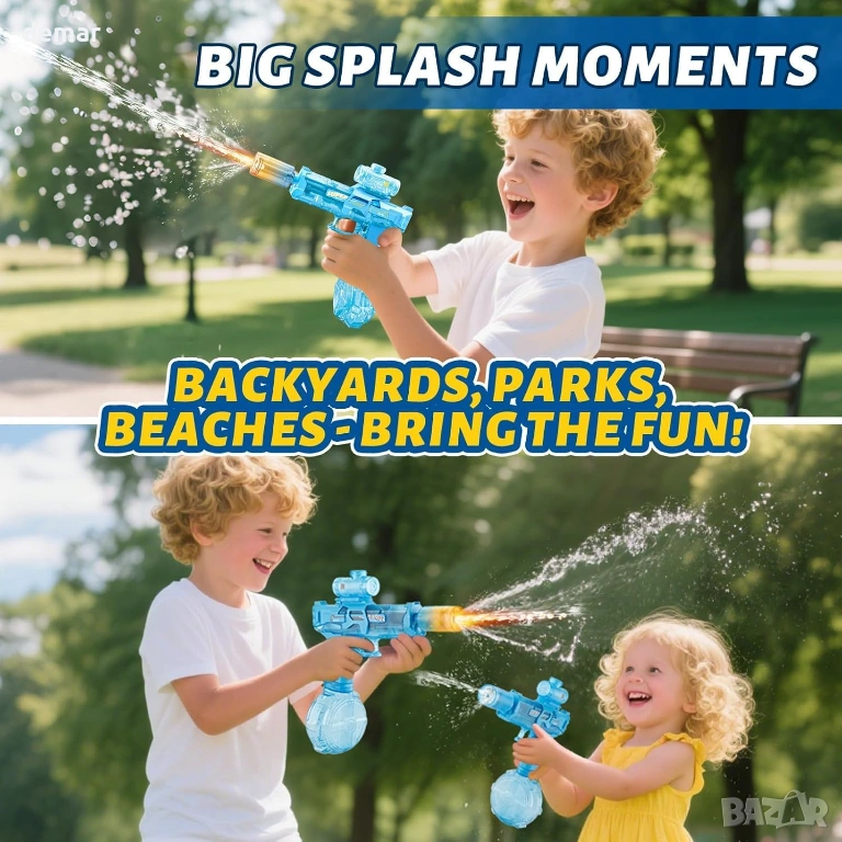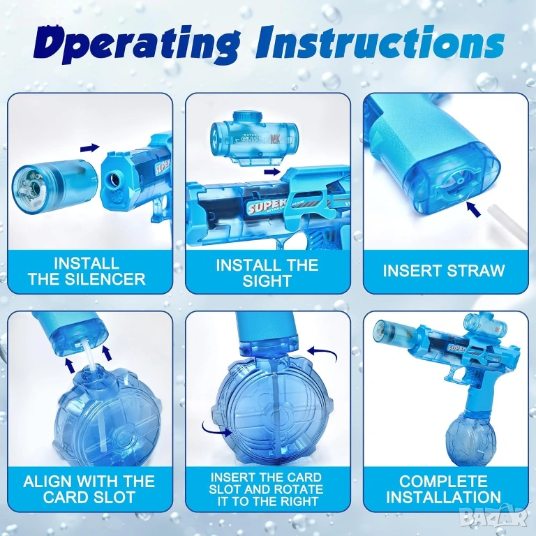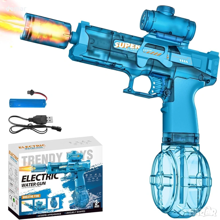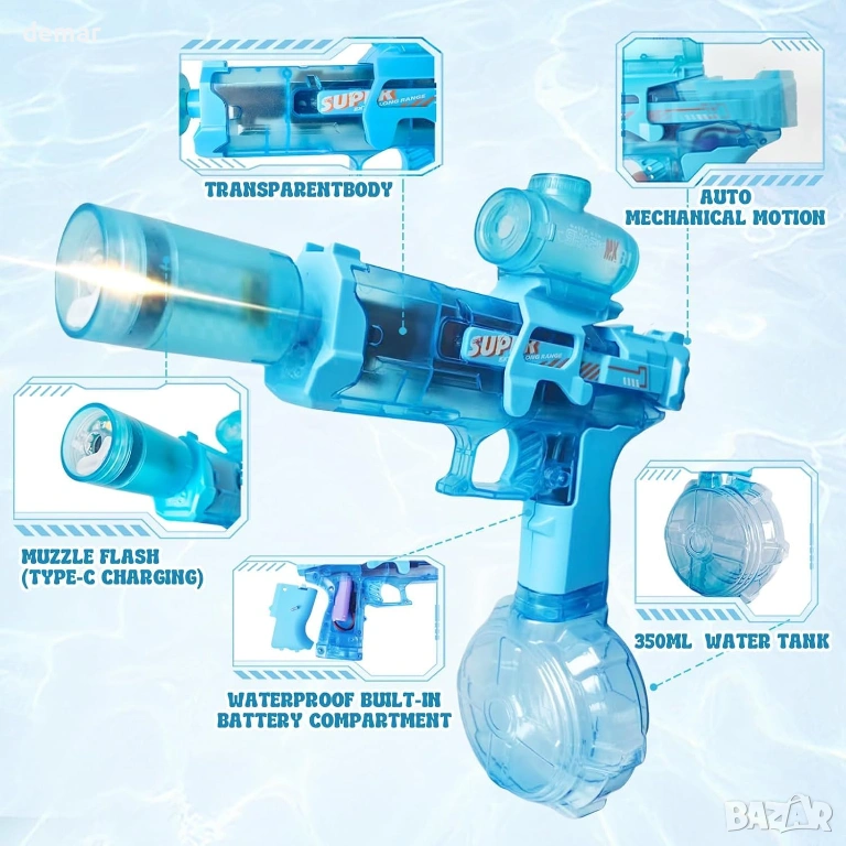 Автоматичен електрически воден пистолет с презареждаща се 3.7V литиева батерия с USB зареждане за удобно и многократно използване, съчетан с подвижна сензорна светлина, която се синхронизира с водните струи за по-ангажиращо изживяване при игра. Проектиран с 320 мл запечатан, херметичен резервоар за вода и автоматично абсорбиране на вода с един бутон, той позволява продължителна игра и по-голям обсег на стрелба. Изработен от издръжливи, безопасни за деца материали с гладки ръбове и ергономична дръжка, той осигурява удобно боравене както за деца, така и за възрастни. Подходящ за дейности на открито, като например плажни дни, игри в басейна, игра в градината и летни партита.