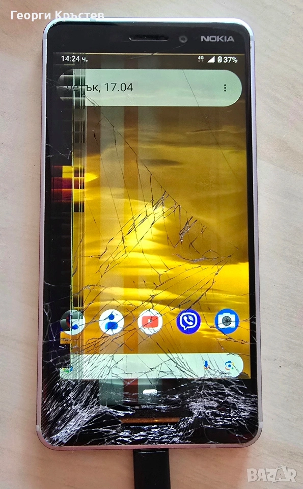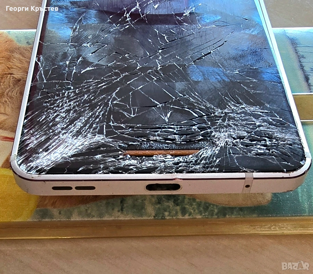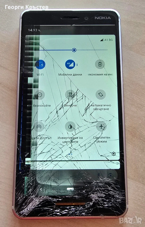 Телефона се включва и работи идеално, тестван с А1, нямам друга за проба, зарежда си батерията, която не е тествана, но телефона се включва, и се провеждат разговори, би трябвало да е ОК, стъклото е счупено, но тъча е ОК, подсветка, камера, слушалка, микрофон, всичко е ОК, няма вписани акаунти, има БГ меню, гърба и лайсните са в много добро състояние, по лайсните има 2 - 3 леки забележки, леко чукнато, но не е фрапантно, много добър външен вид, в интернет бях попаднал някъде, продават само стъкла за по 10 - 15 €, или стъкло и тъч за по 20 - 25 €, без зарядно.