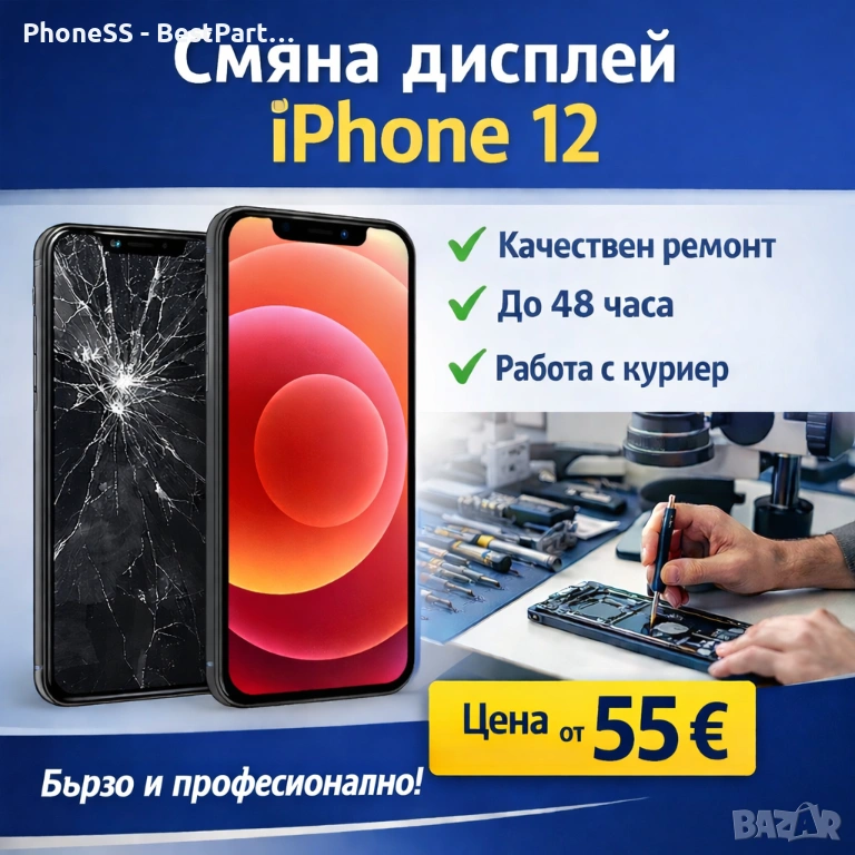 Предлагаме професионална смяна на дисплей за iPhone 12 на добра цена, с бързо изпълнение и гарантирано качество.