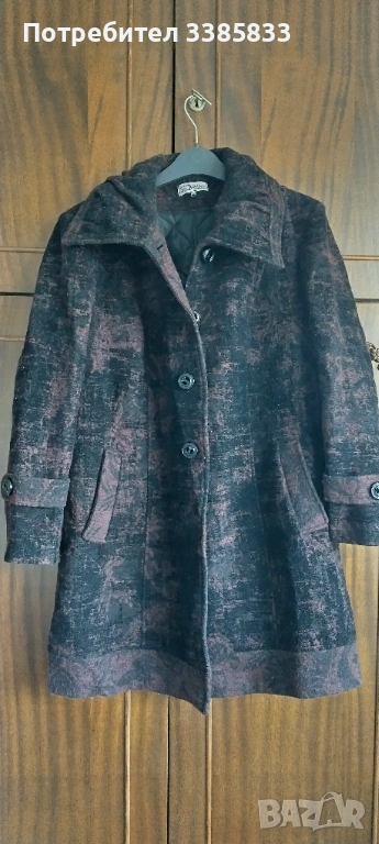 Зимно , топлещо палто, българско производство. Има допълнителна подплата, леко вталено, яката е много интересна. Номер 52., което отговаря на 2XL до 3XL. Носено е малко време. Цветовете са тъмно вишнево и черно. ( на снимката не се виждат добре). Материал-вълна и полиестер.