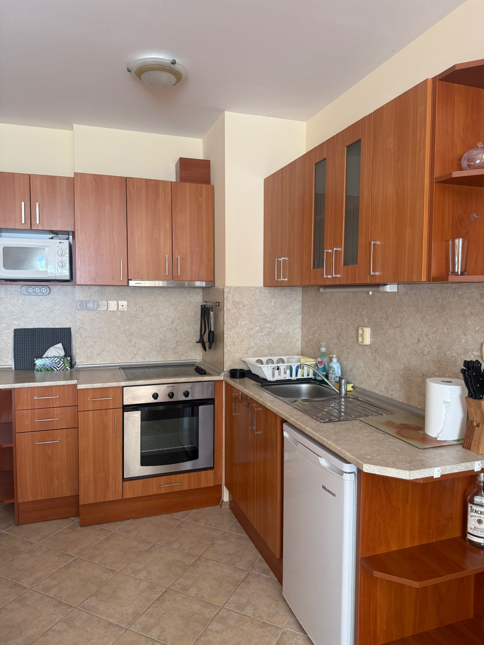 светла и просторна всекидневна с модерно обзаведен кухненски бокс, оборудван с висок клас електроуреди
