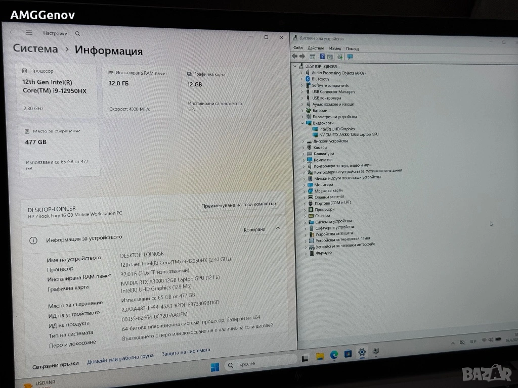 —- HP Zbook Fury G9 16 - 16’ WUXGA IPS 1920x1200 Color Calibration 500 nits/ Intel Core i9-12950HX 16-ядрен/24-нишки 30MB Cache/32GB DDR5 4800Mhz / 512GB SSD Nvme / Nvidia RTX A3000 12GB GDDR6 / Подсветка/—-