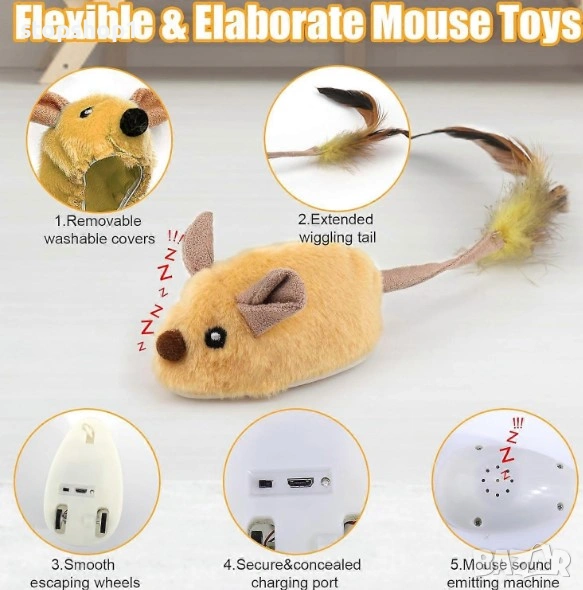 Интерактивна играчка за котки,кучета, движеща се играчка мишка,презареждаща се, със звук, до 120 минути употреба