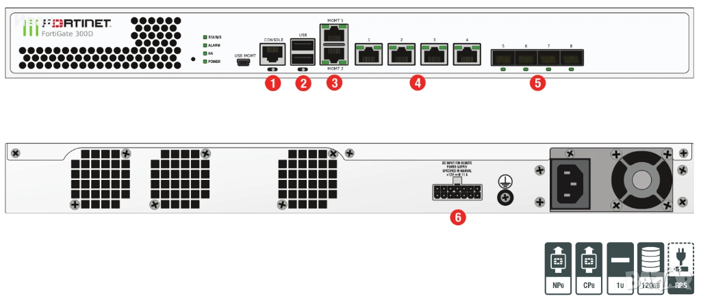 (6x GE RJ45 ports, 4x GE SFP slots, SPU NP6 and CP8 hardware accelerated, 120 GB onboard storage)