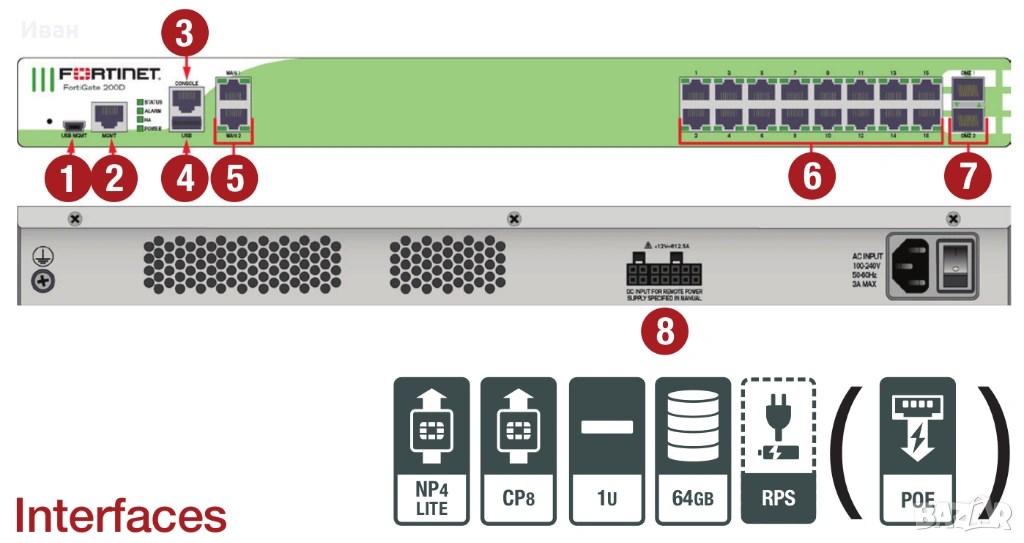 (18 x GE RJ45 (including 16 x LAN ports, 2 x WAN ports), 2x GE SFP DMZ ports, SPU NP4Lite and CP8 hardware accelerated, 64GB onboard SSD storage)