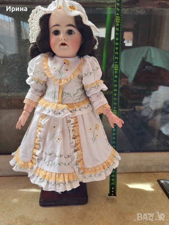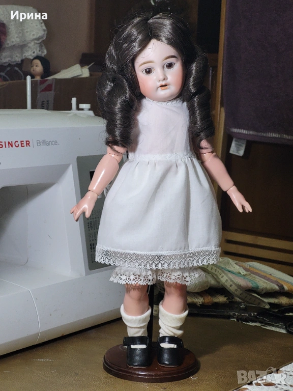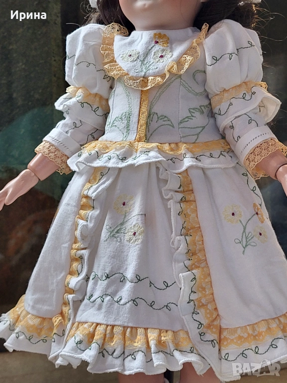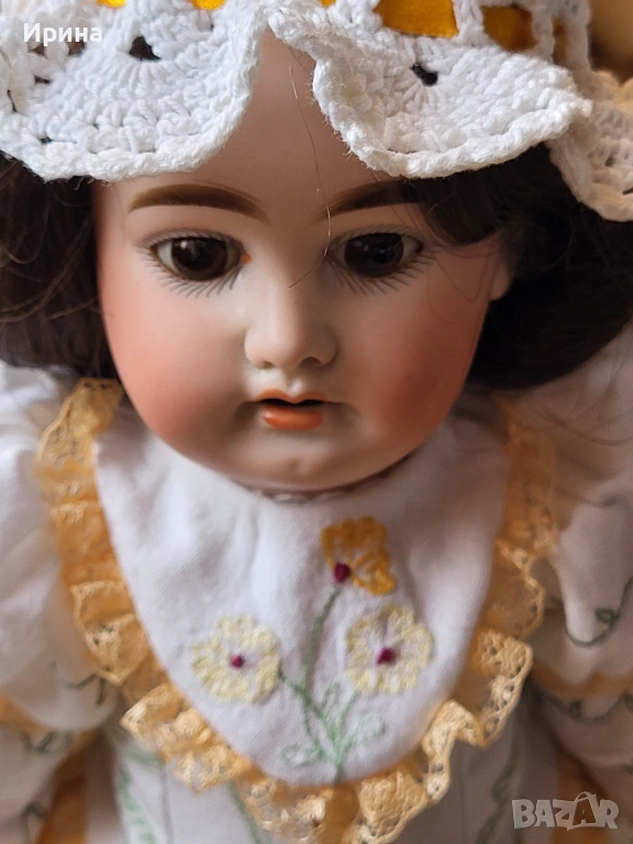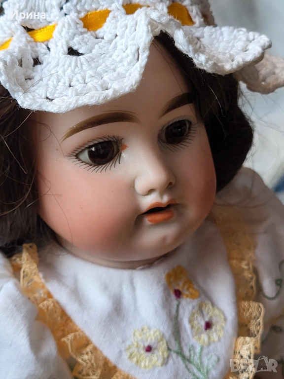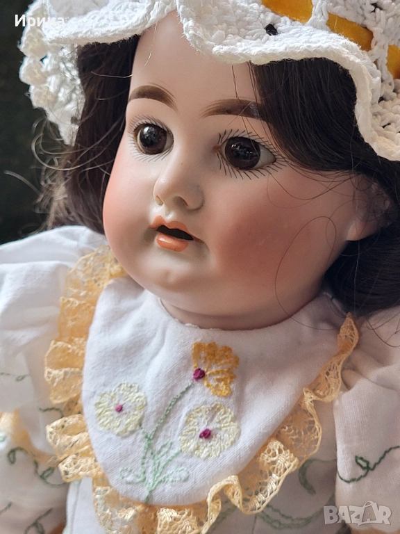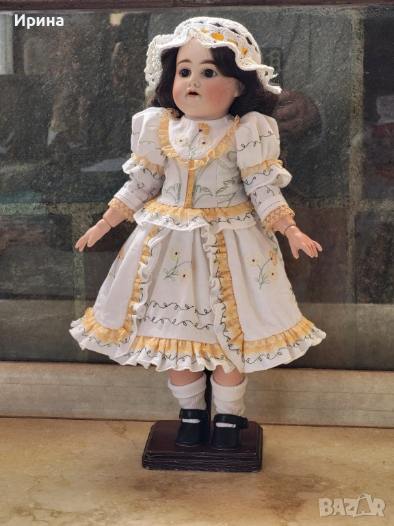 Антична кукла, калъп номер 1894, от Арман Марсел. Височина: почти 40 см. Това е прекрасен пример за творчеството на този художник, произведено в Германия около 1900 г. за френския пазар, както се вижда от наличието на DЕP в маркировката ѝ. Тези кукли се отличавали с по-висококачествена и красива рисунка на лицето, а също така често имали пробити ушни миди, за да може куклата да бъде украсена с обеци, както при френските кукли. Композитното тяло е непокътнато, с оригиналното си покритие, и е в отлично състояние. Тя има очарователно изражение на лицето, нежна усмивка и красиви кафяви очи, създадени с помощта на древна техника на стъклодуване и постоянно прикрепени, подобно на ранните кукли. Винтидж перуката е изработена от синтетични влакна с дълги, стегнати къдрици. Добавена е по-късно. Куклата е достатъчно опъната и добре позира. Тя е облечена в красив тоалет, ушит по модата на времето и перфектно допълващ кукления ѝ образ. Бельото ѝ е украсено с дантела. Горната ѝ рокля, изработена от памучен плат, е богато обточена с волани и дантела. Всички елементи също са украсени с бродерия. Шапката ѝ, в същия цвят, е плетена на една кука и драпирана със сатенена панделка. Тази красива шапка подхожда на стила на роклята. Тя носи обувки и чорапи като на кукла.