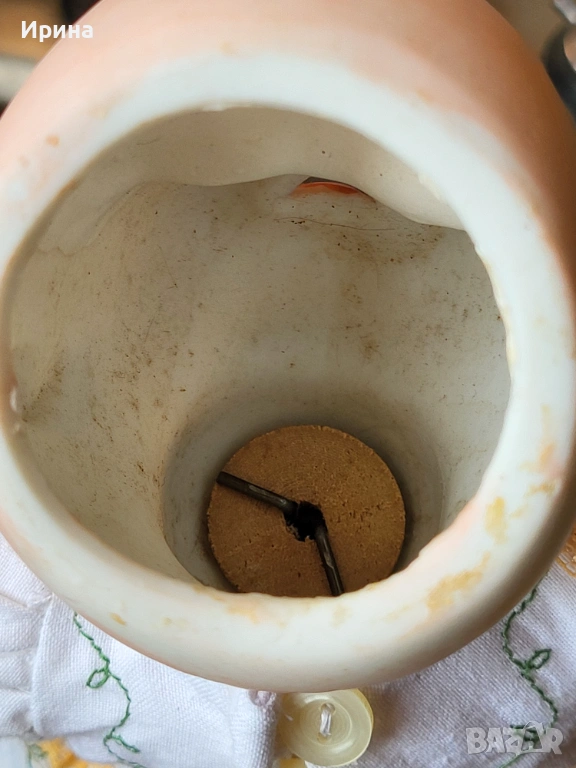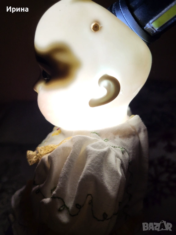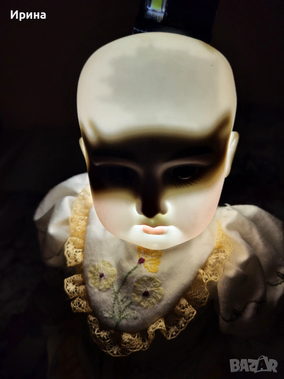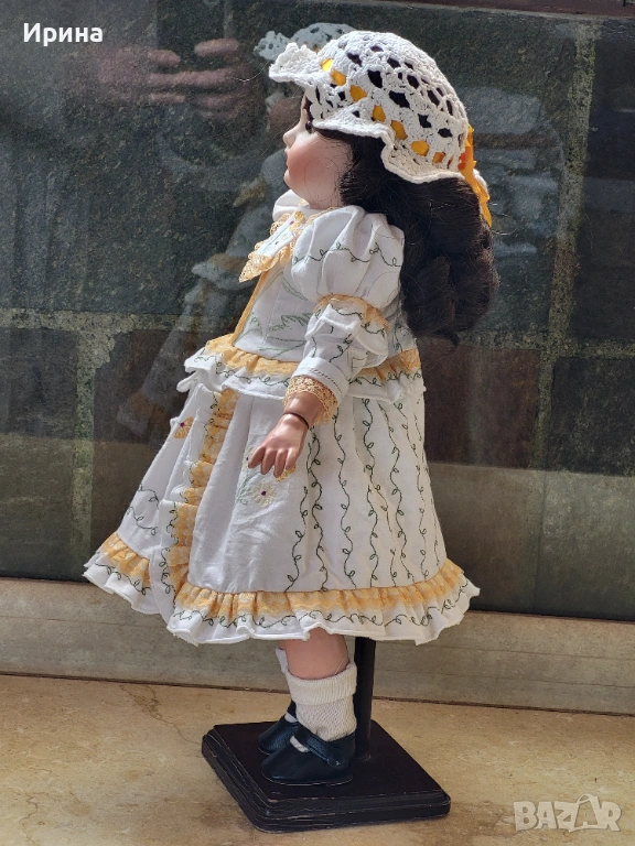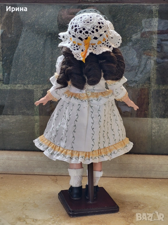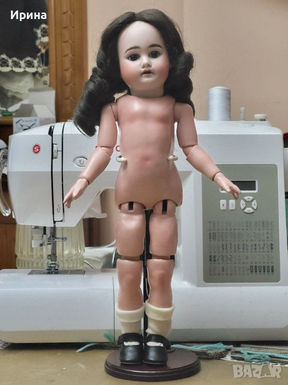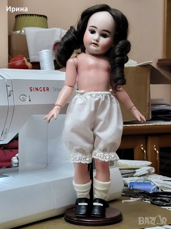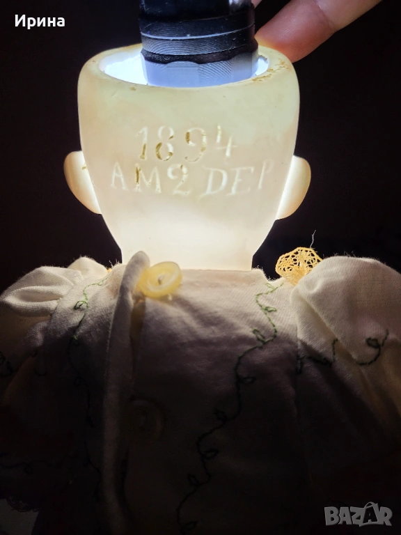 Антична кукла, калъп номер 1894, от Арман Марсел. Височина: почти 40 см. Това е прекрасен пример за творчеството на този художник, произведено в Германия около 1900 г. за френския пазар, както се вижда от наличието на DЕP в маркировката ѝ. Тези кукли се отличавали с по-висококачествена и красива рисунка на лицето, а също така често имали пробити ушни миди, за да може куклата да бъде украсена с обеци, както при френските кукли. Композитното тяло е непокътнато, с оригиналното си покритие, и е в отлично състояние. Тя има очарователно изражение на лицето, нежна усмивка и красиви кафяви очи, създадени с помощта на древна техника на стъклодуване и постоянно прикрепени, подобно на ранните кукли. Винтидж перуката е изработена от синтетични влакна с дълги, стегнати къдрици. Добавена е по-късно. Куклата е достатъчно опъната и добре позира. Тя е облечена в красив тоалет, ушит по модата на времето и перфектно допълващ кукления ѝ образ. Бельото ѝ е украсено с дантела. Горната ѝ рокля, изработена от памучен плат, е богато обточена с волани и дантела. Всички елементи също са украсени с бродерия. Шапката ѝ, в същия цвят, е плетена на една кука и драпирана със сатенена панделка. Тази красива шапка подхожда на стила на роклята. Тя носи обувки и чорапи като на кукла.