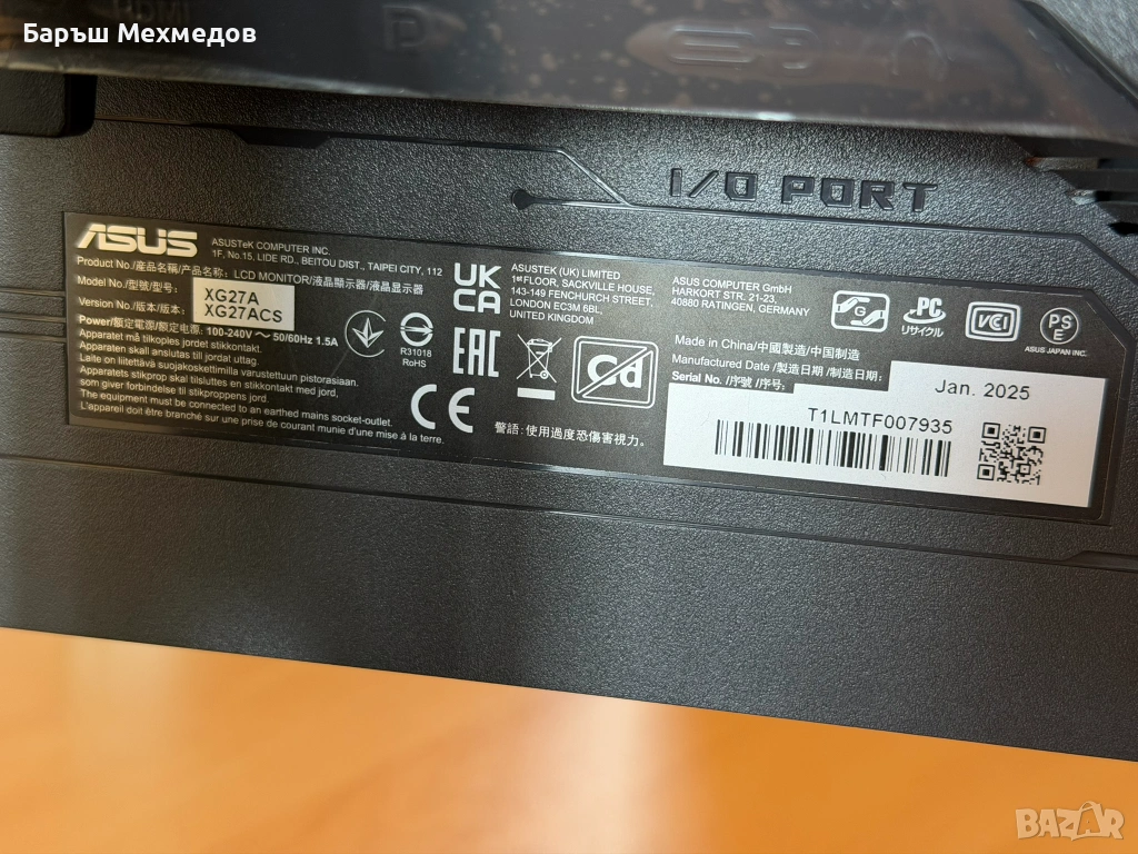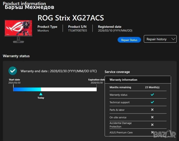 - Гаранция: Мониторът е официално регистриран и в гаранция към ASUS до 30/03/2028 г. (вижте приложените снимки).