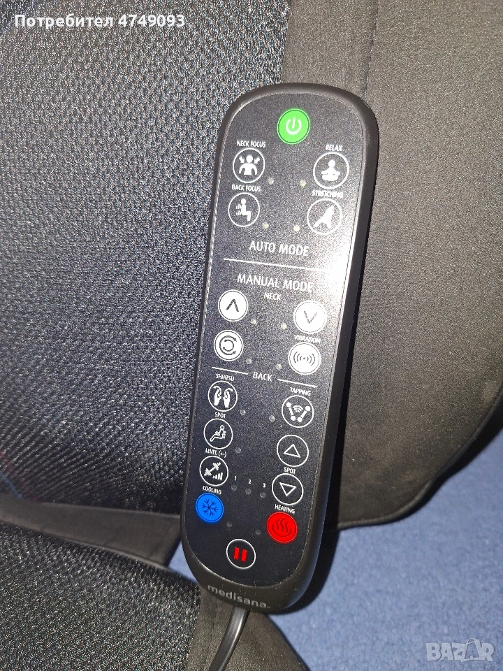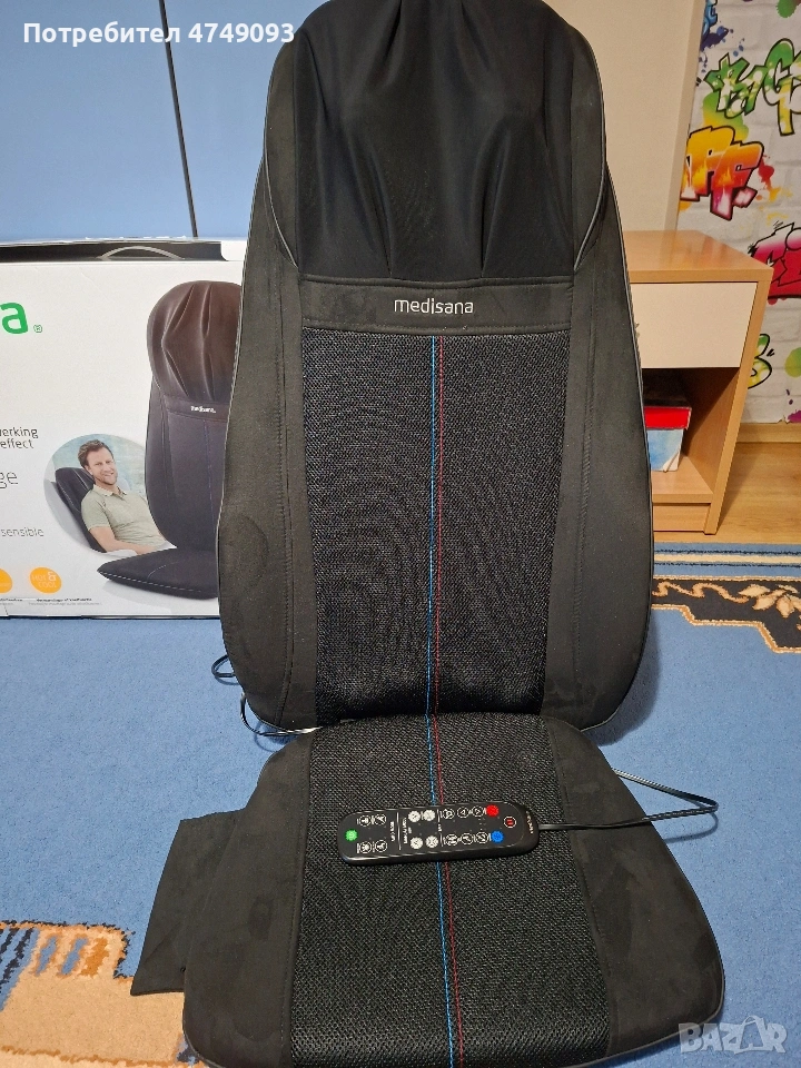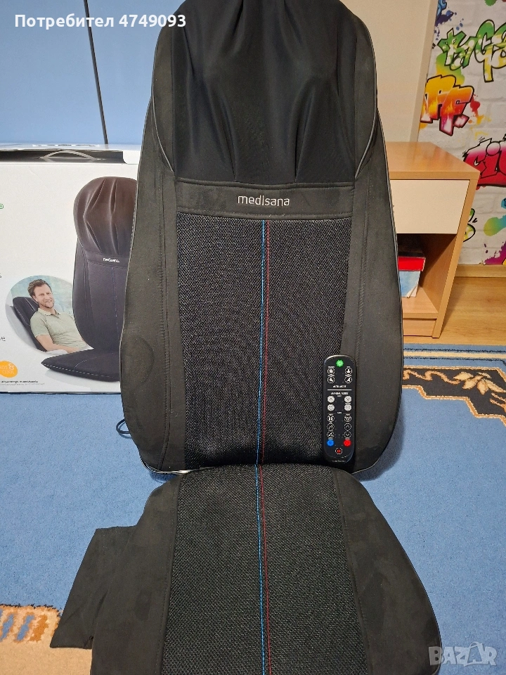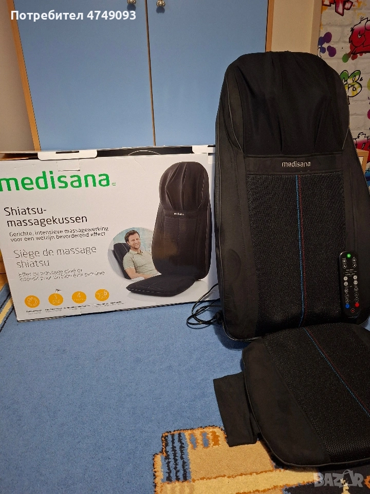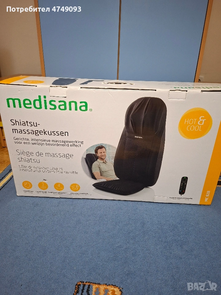 Масажираща седалка за шиацу, акупресурен и точков масаж Medisana, Германия - цвят черен. Висококачествен масажор Гел масажни глави – за нежно и естествено масажно изживяване 3 вида масаж: шиацу, акупресурен и спот масаж Шиацу масаж на гърба с две двойни гел масажни глави 3 избираеми масажни зони на гърба: цял гръб, горна част на гърба, долна част на гърба Спот (точков) масаж на гърба Отделен шиацу масаж на врата с регулируема височина Демо бутон за представяне на всички масажни функции Автоматично изключване след 15 минути Дистанционно управление Удобна велкро лента за закрепване на стола Лесен за почистване и поддържане материал Дължина на захранващия кабел: 1.8 метра Захранване: 220 - 240 V / ~ 50 - 60 Hz Консумирана мощност: около 40 W Размери (В х Ш х Д): около 124.5 х 43.5 х 19 см Тегло: 7 кг Цвят: черен Комфортният масаж на масажиращата седалката Medisana MC 828, превръща всеки фотьойл в УЕЛНЕС ОАЗИС у дома. Прецизният шиацу масаж гарантира холистичен релакс, благодарение на особено меките глави от гел. С практичното дистанционно управление, функцията червена светлина и топлина може да бъде включена, а масажните функции да се настройват индивидуално. Общо 3 вида масаж, три масажни зони, отделно шиацу масаж на врата и 3 интензивности на акупресурен масаж могат да бъдат избрани.