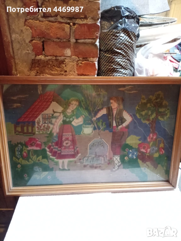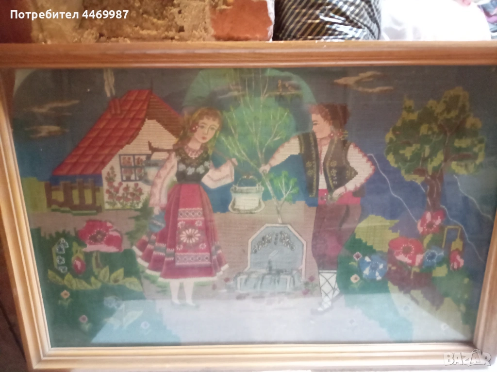 Тази картина е стар български тъкан гоблен, изобразяващ героите Гергана и Никола от известната поема на Петко Славейков "Изворът на Белоногата