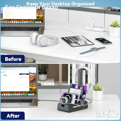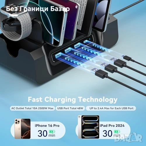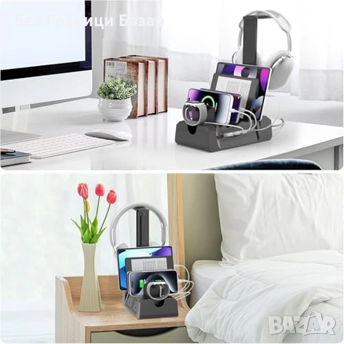 Нова 6 в 1 зарядна станция с AC USB USB-C за телефон таблет слушалки и часовник