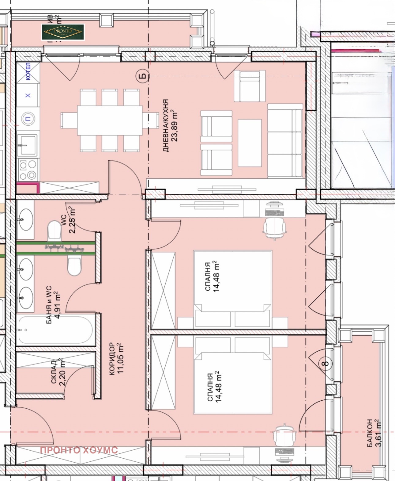 Състои се от просторна дневна с кухненски бокс и трапезарна част ,две спални,баня със санитарен възел, отделна тоалетна, склад и две тераси.