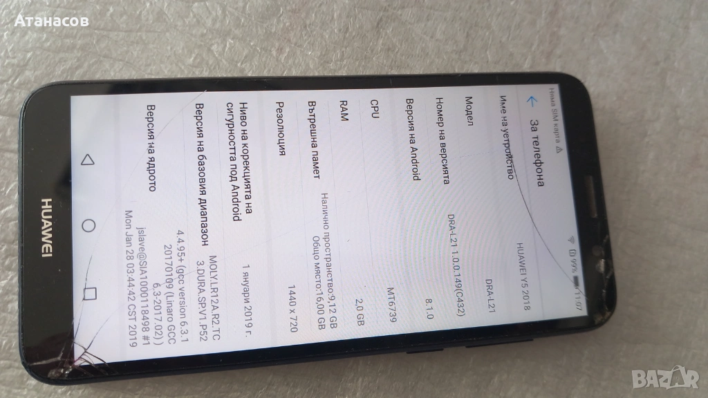 Huawei Y5 2018 Dual SIM 16GB работещ, с лош външен вид.5.45-инчов LCD , Android 8.1 (Oreo) .Supports microSD cards up to 256GB.Продава се без зарядно.