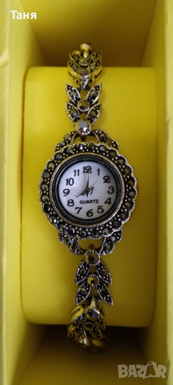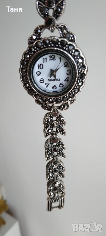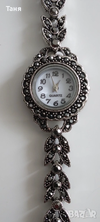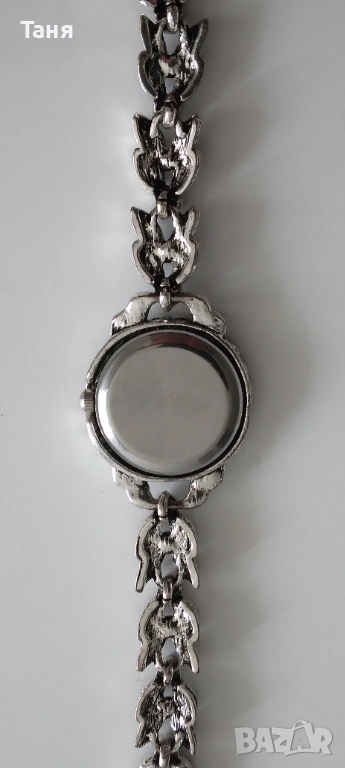 Сребрист часовник с блестящи камъчета. Дължината заедно с корпуса е 17 см, но с допълнителния елемент може да се удължи до 18,5 см. Батерията е нова.