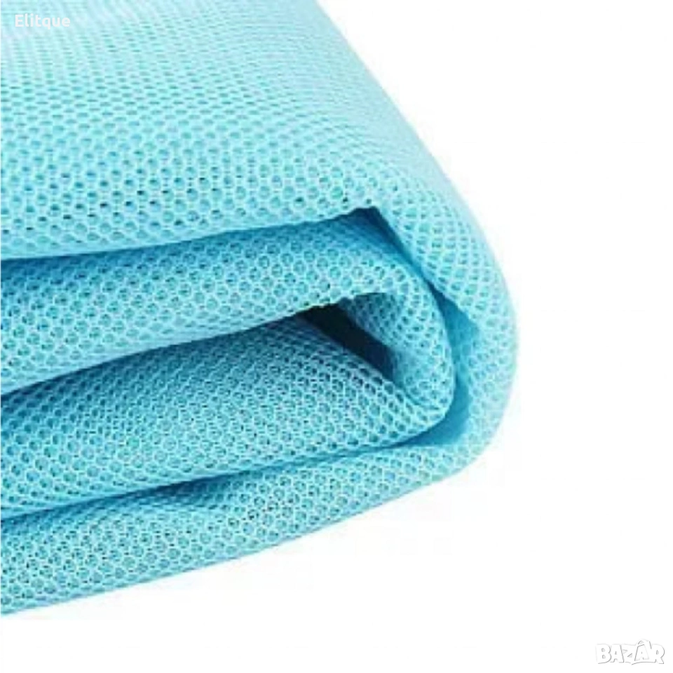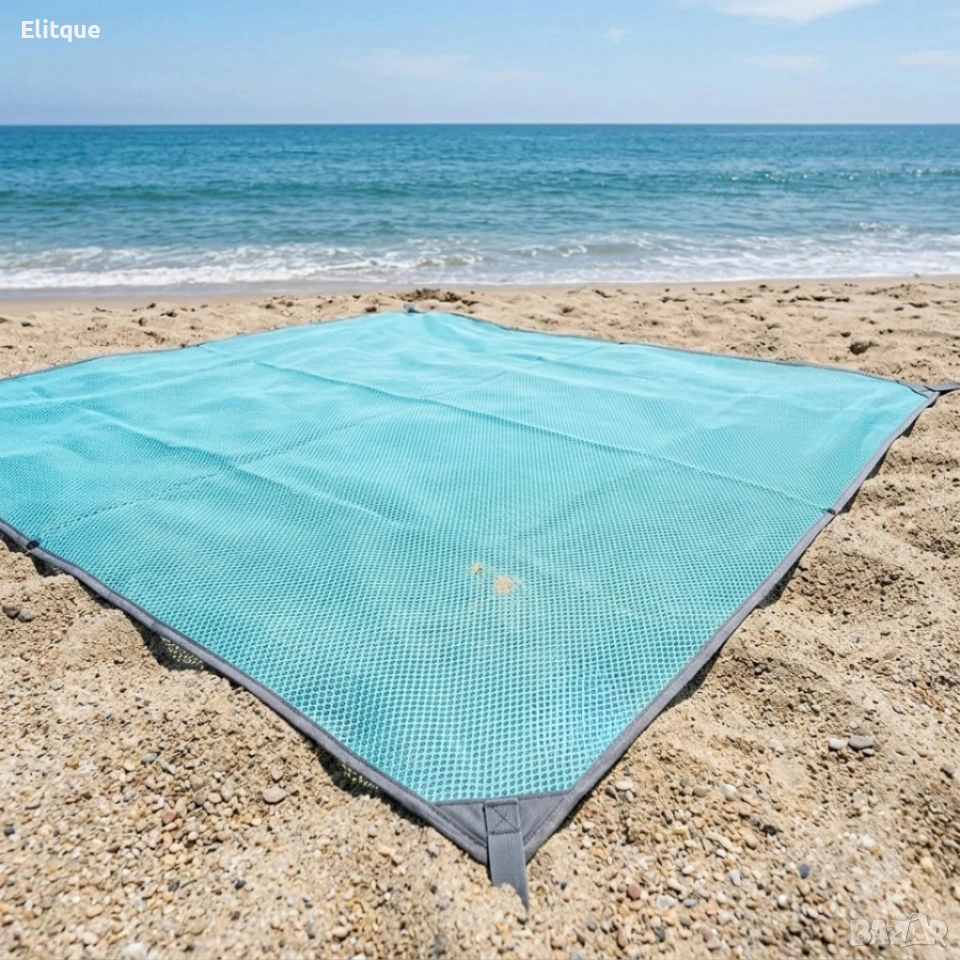 Технически характеристики на Плажна постелка без пясък XXL – двуслойна мрежа, водоустойчива, лека и компактна за плаж, къмпинг и пикник Пълните данни, които да ви убедят веднага: Размери: 200 x 200 см (XXL) Тегло: приблизително 400 g Материал: двуслойна мрежеста технология със заздравени ръбове Цвят: син Фиксация: 4 метални О-пръстена в ъглите (колчета не са включени) Предназначение: плаж, къмпинг, пикник, градина Почистване: бързо изтриване, изплакване или машинно пране при необходимост
