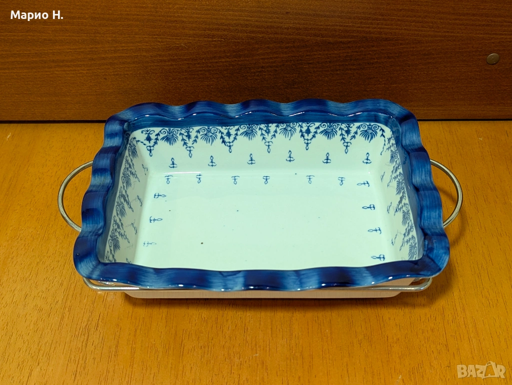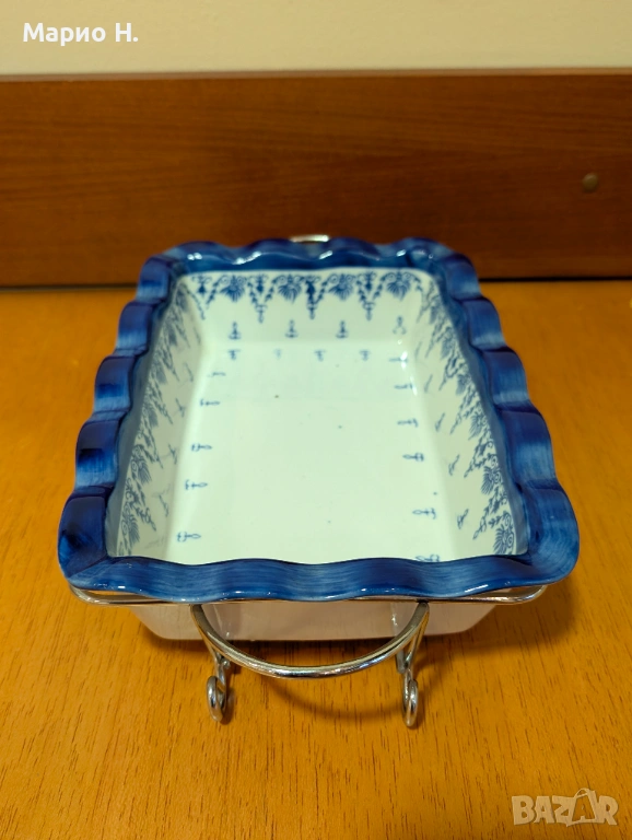 Продавам красива и практична правоъгълна тава за печене, в комплект с метална стойка за сервиране. Чисто нова и неизползвана.