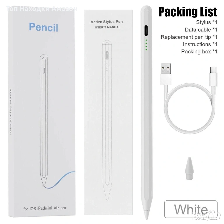 Стилус съвместим с iPad, бял, 16,5 см, с индикатор за зареждане, комплект с резервен връх и USB-C кабел.