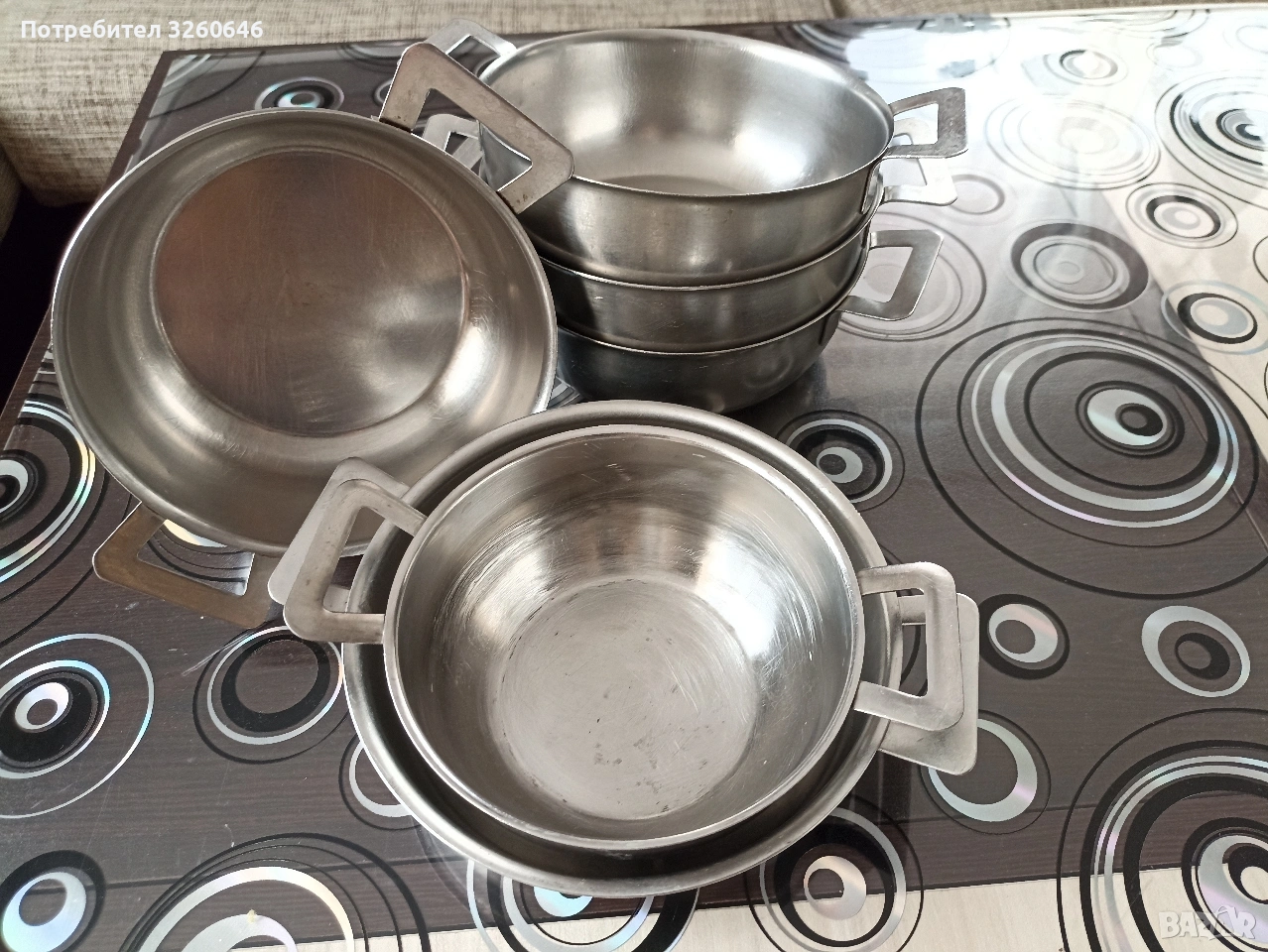 От старото производство на завода, дебели. Четирите са еднакви, една е по-плитка и по-широка, друга е малко по-малка от четирите еднакви. Вместимост 500мл.