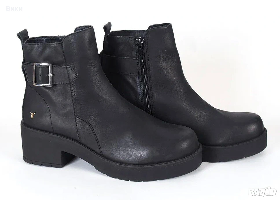 Това са дамски боти на австралийската марка Windsor Smith, отличаващи се с характерното златисто лого с глава на бик отстрани. Моделът е изработен от естествена кожа и разполага със стабилен среден ток и декоративна каишка с метална катарама.