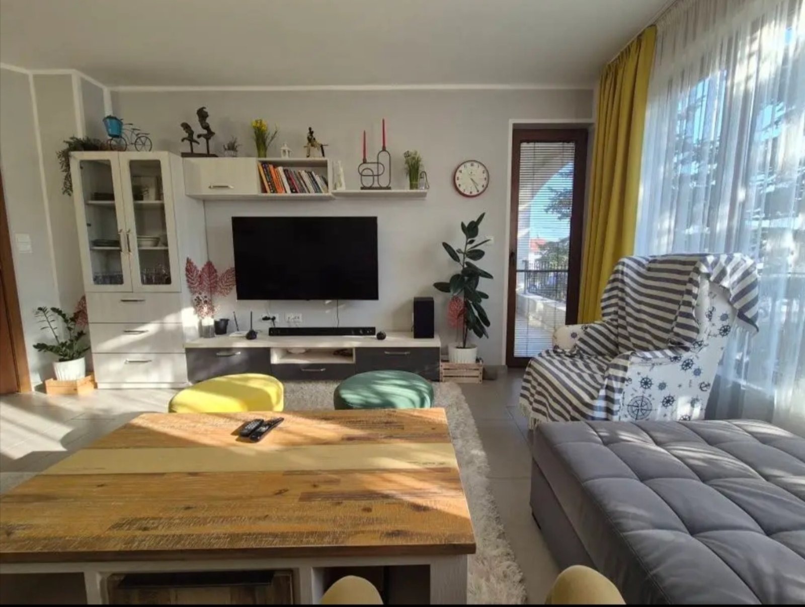 ✅ Напълно обзаведен: голяма маса за хранене (6 души), холна маса от естествено дърво, разтегателен диван и телевизор LG.