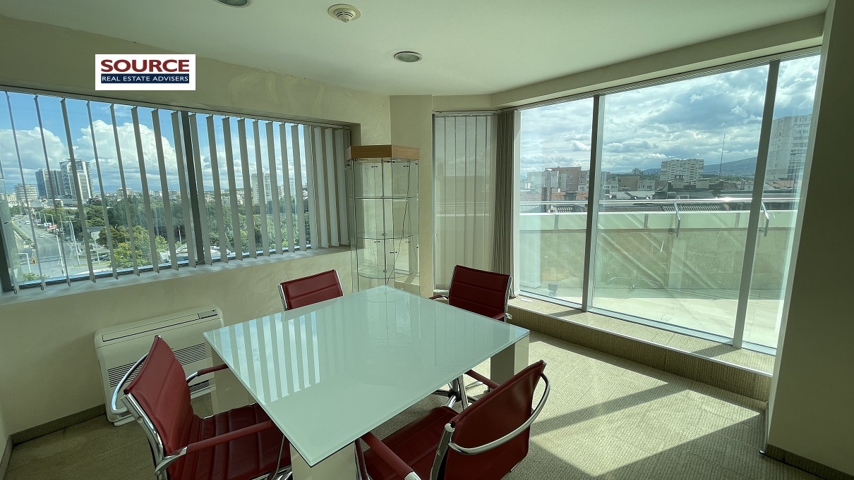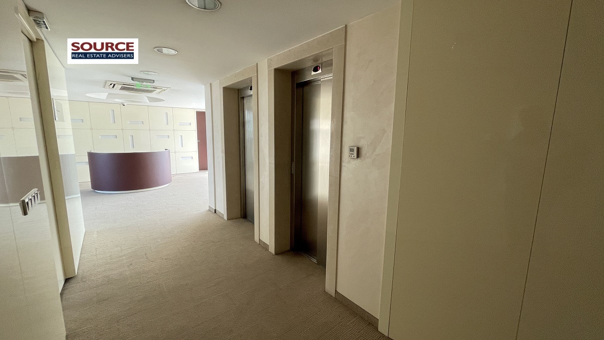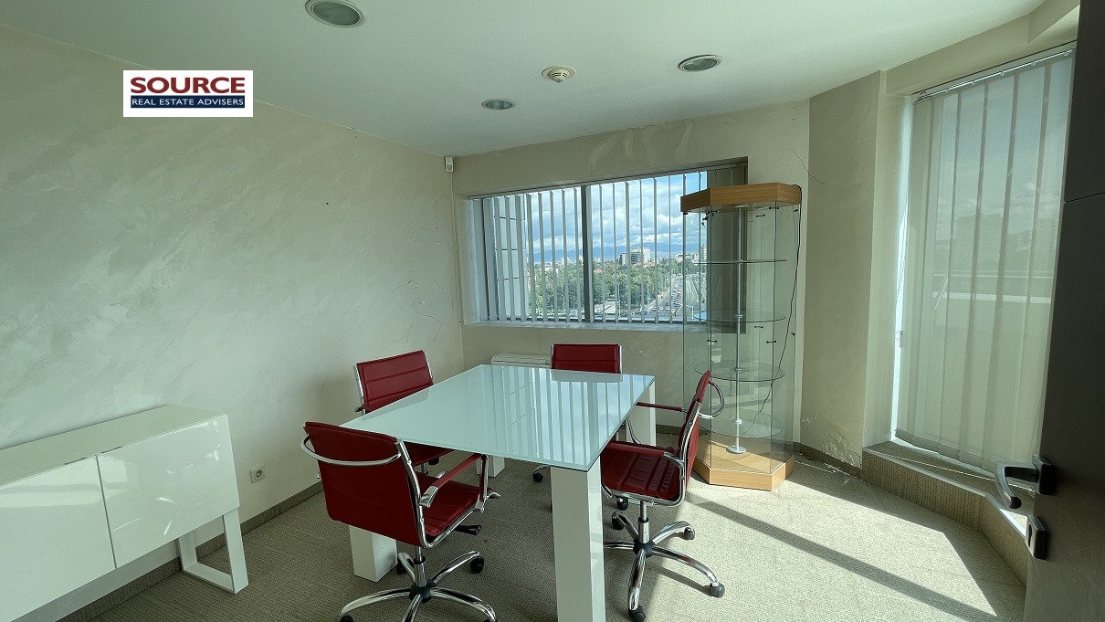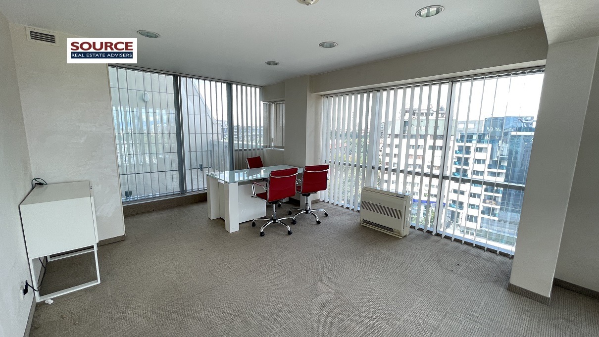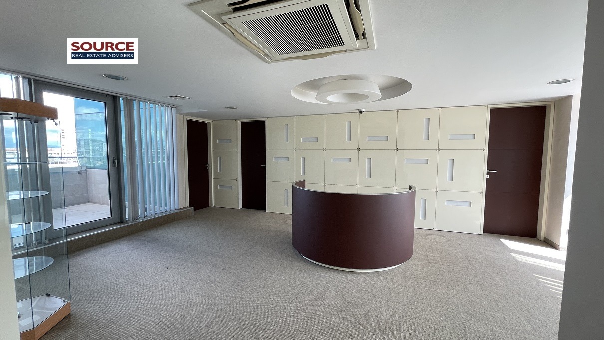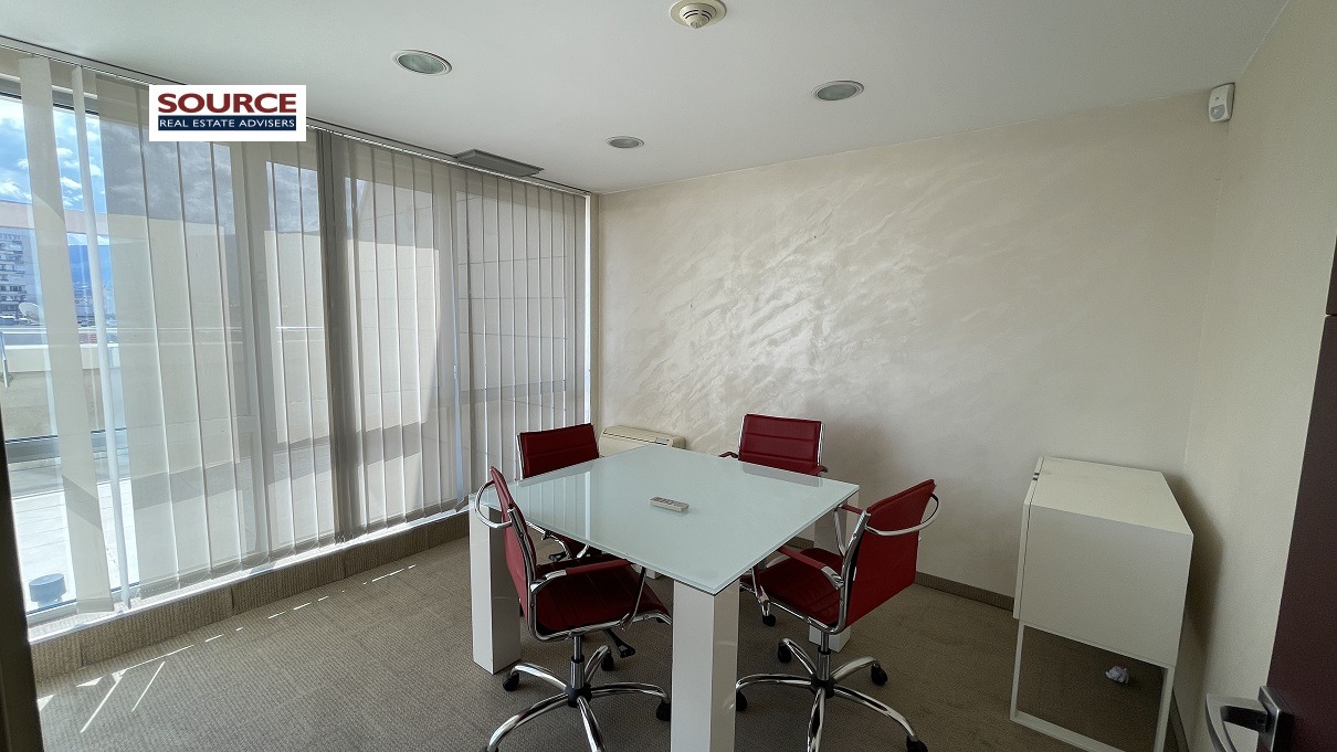 2. Разпределение: Представителна рецепция, 6 отделни помещения преградени с гипсокартонени преградни стени, кухня, сървърно помещение, 2 wc, панорамна тераса. Офисът може да бъде изцяло с Open space разпределение или допълнително преграден според изискванията на Наемателя.