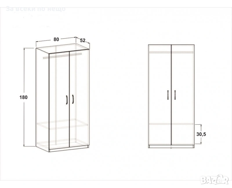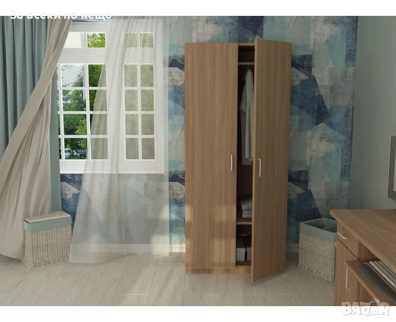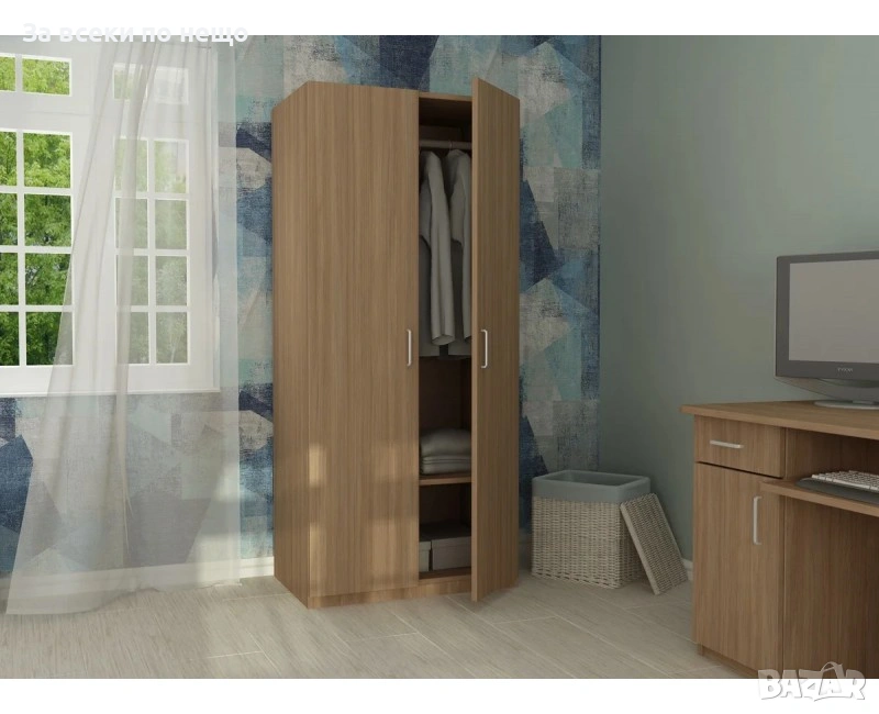 Двукрилен гардероб G1 е практичен и компактен, подходящ за спални и детски стаи. Вътрешно му разпределение е с лост за закачалки и долен рафт.