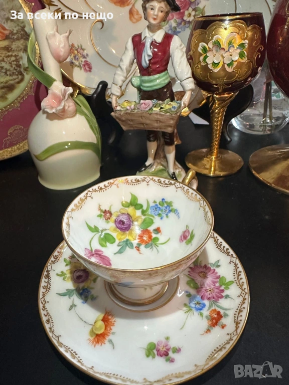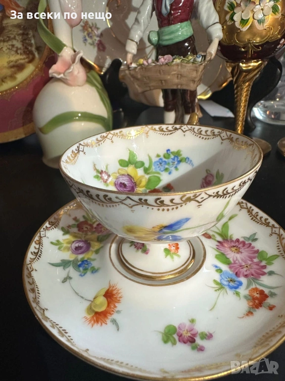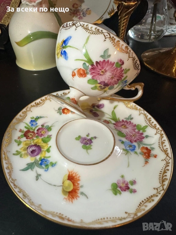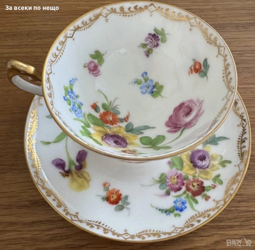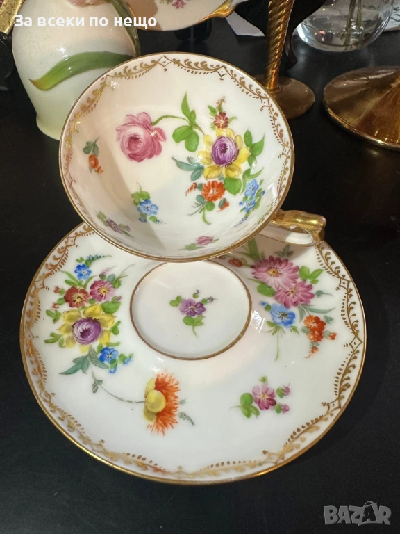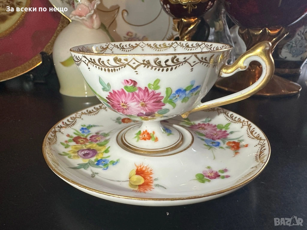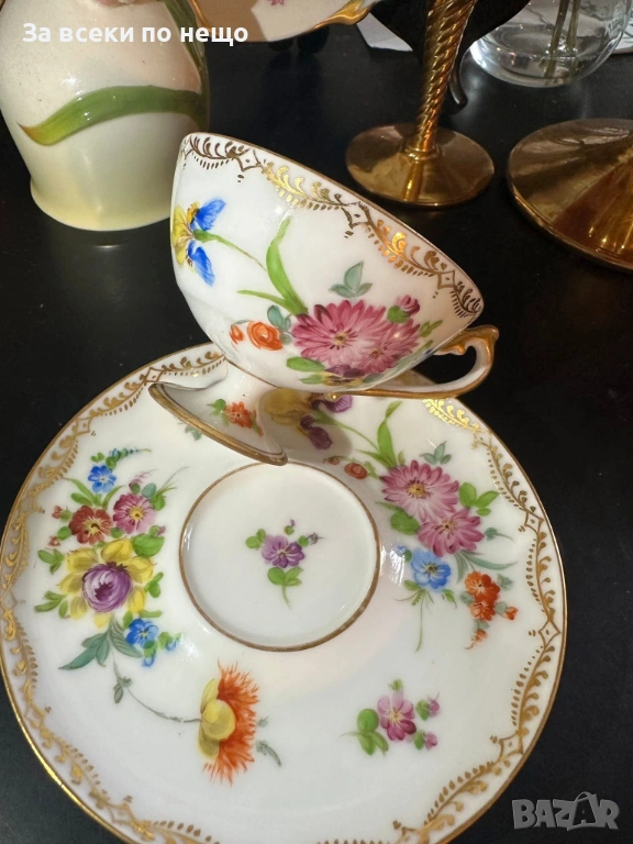 Dresden Germany Circa 1894 “Richard Klemm” “Великолепният” - прекрасен, ръчно изрисуван и с невероятно интересна форма, немски двоен сет, вместимост на чашката 100 мл, феерия от класа, цветя, букети и деликатен златен финиш, отлично качество и състояние, изключителна класа и чар.