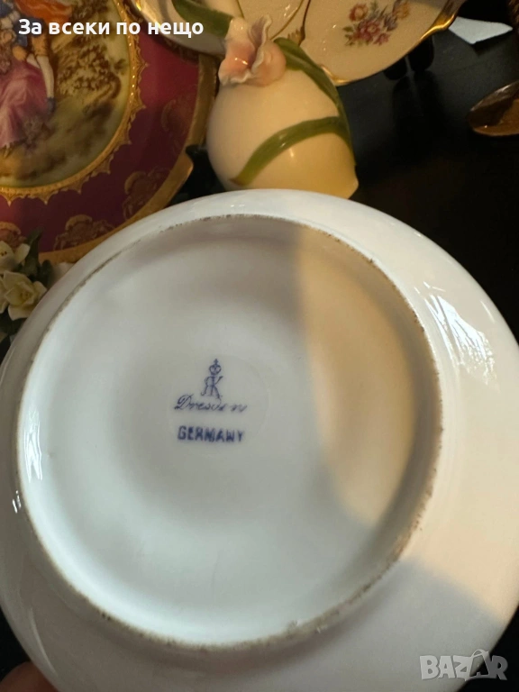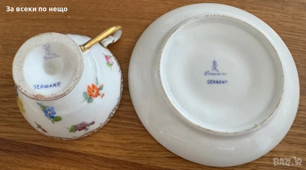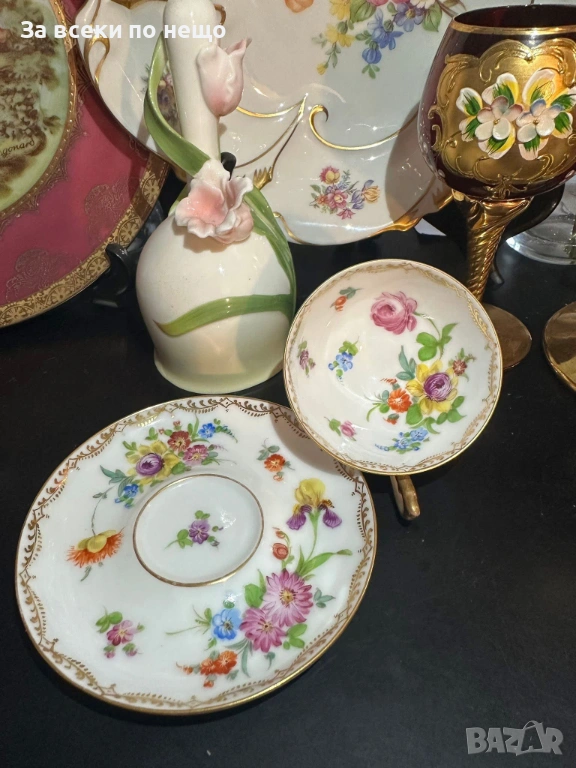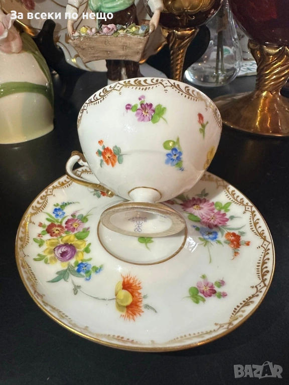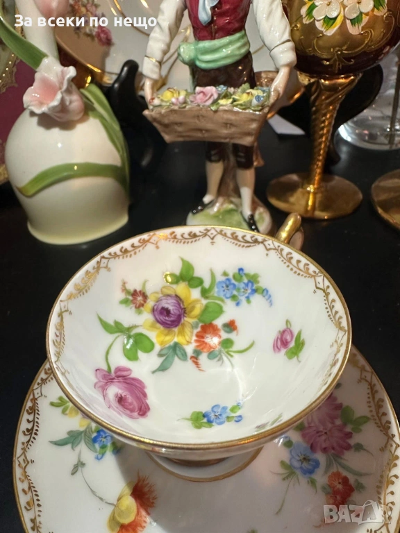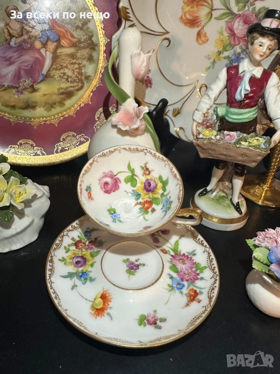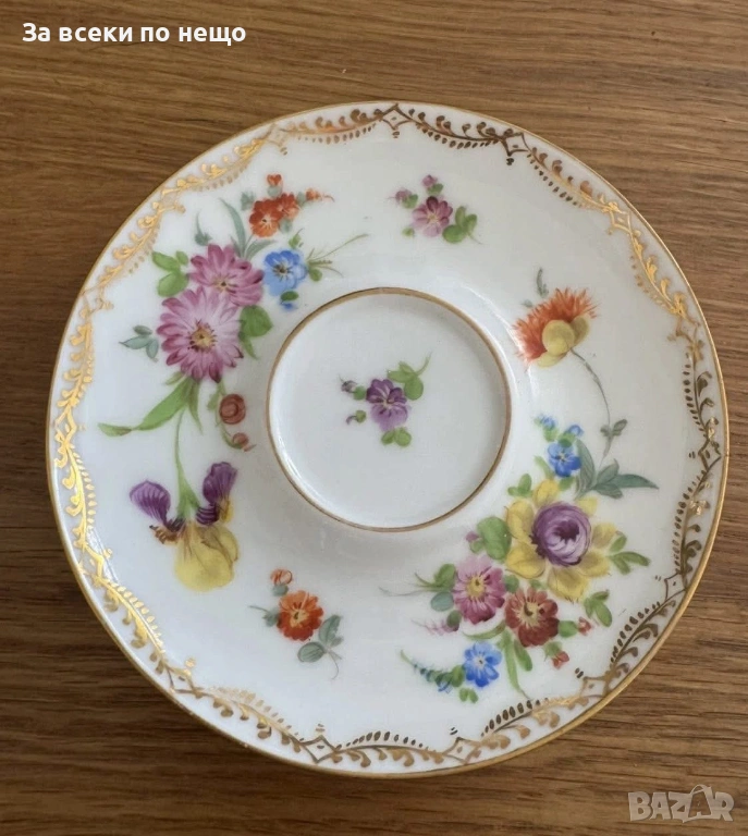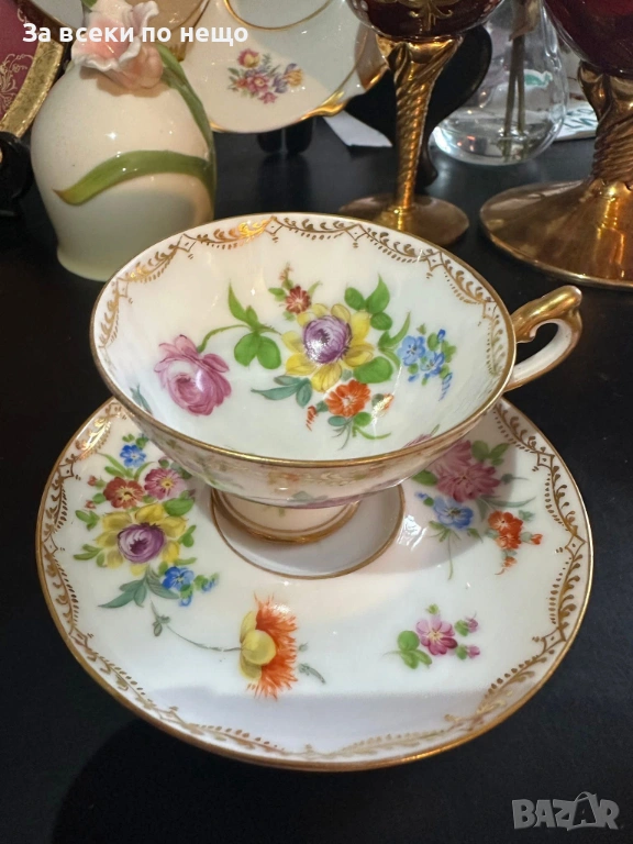 Dresden Germany Circa 1894 “Richard Klemm” “Великолепният” - прекрасен, ръчно изрисуван и с невероятно интересна форма, немски двоен сет, вместимост на чашката 100 мл, феерия от класа, цветя, букети и деликатен златен финиш, отлично качество и състояние, изключителна класа и чар.