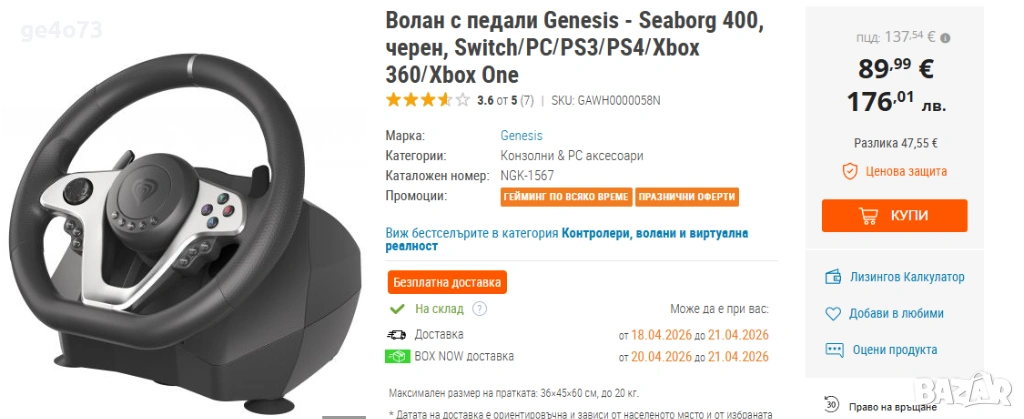 Воланът Seaborg 400 е съвместим с Xbox 360 (в този случай трябва да имате и оригинален жичен контролер), Xbox One, Nintendo Switch, PlayStation 3 и PlayStation 4, което ви позволява да превключвате между конзолите, когато искате! Работи както в режим X-Input, така и в D-Input. Можете също така да играете с него на компютър с Windows XP, Vista, 7, 8, 10 и 11.