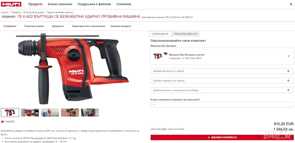 Продавам безчетков акумулаторен перфоратор на Хилти със запазен външен вид, също така работи и функционира отлично, без никакви забелеки, внос от Франция. Обявената цена е за само боди без батерии и зарядно. При желание на клиента може да се окомплектова с 2 батерии по 5.2Ah и зарядно за 450евро. Пращаме с опция преглед и тест с куриерска фирма еконт, може и лично предаване за гр. Шумен.