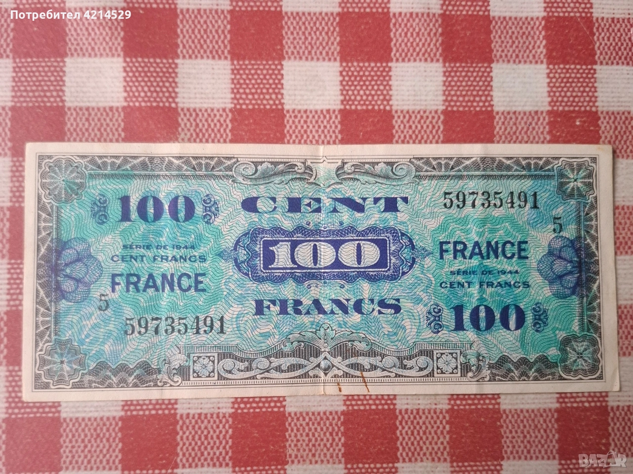 Френска банкнота от 100 франка, издадена през 1944 г..