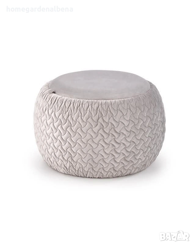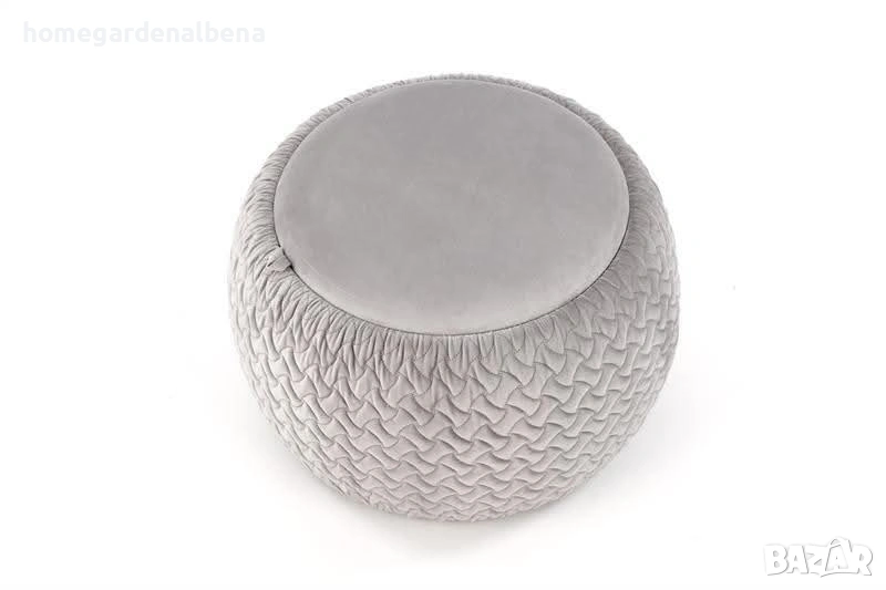 табуретка Bono с мека велурена повърхност и релефна текстилна структура. Скрит контейнер за съхранение под капака — практично решение за всекидневна, спалня или детска стая. Капакът може да се използва и като декоративна масичка.