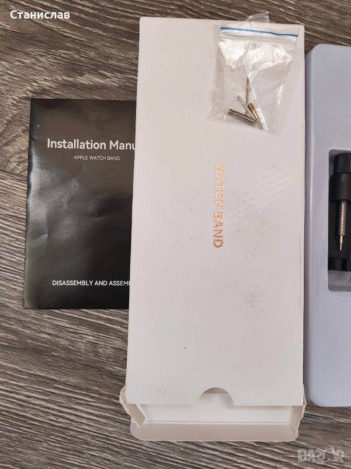 Това е метална каишка от неръждаема стомана за Apple Watch, която включва инструмент за регулиране на размера.
