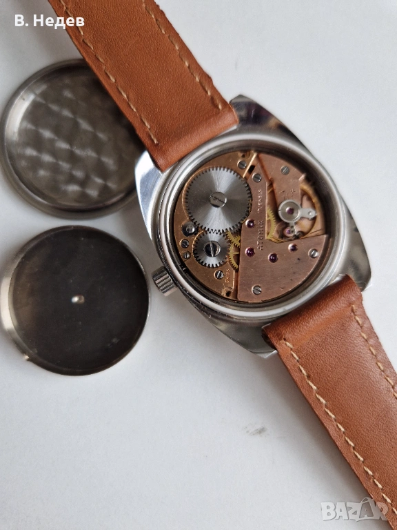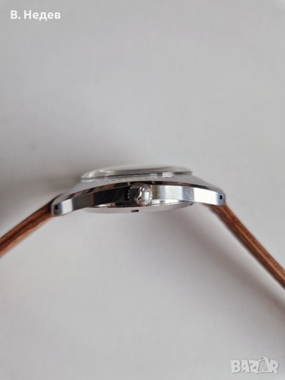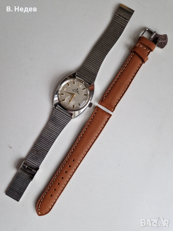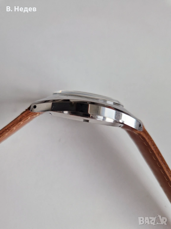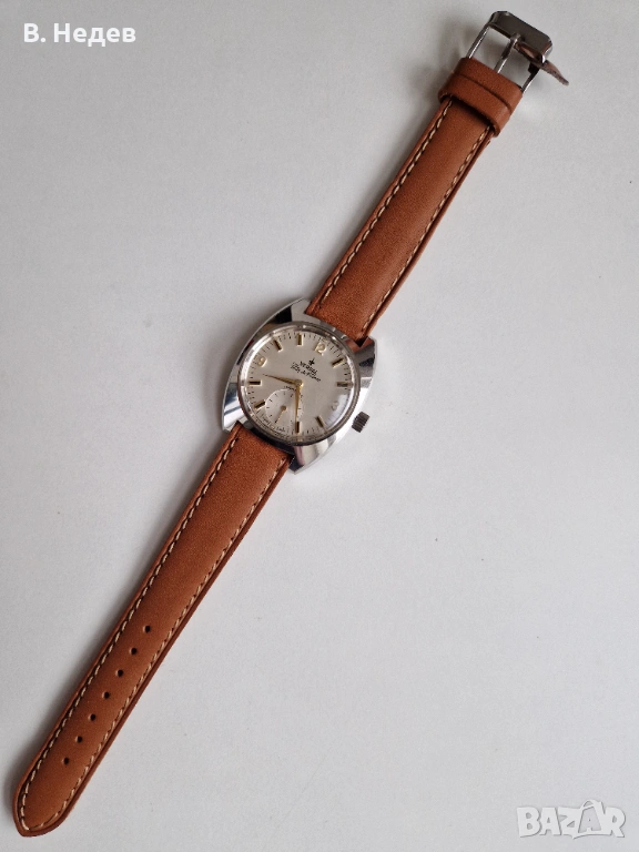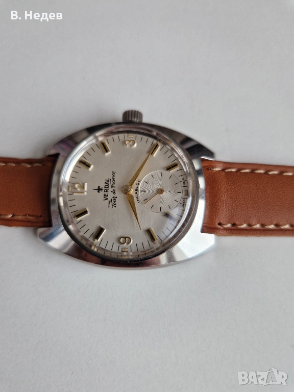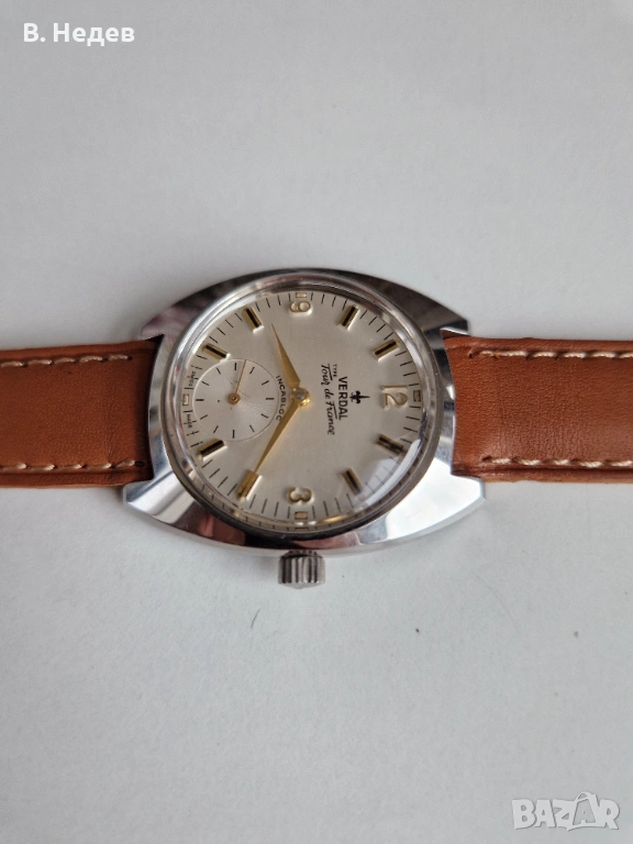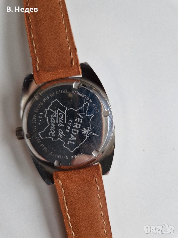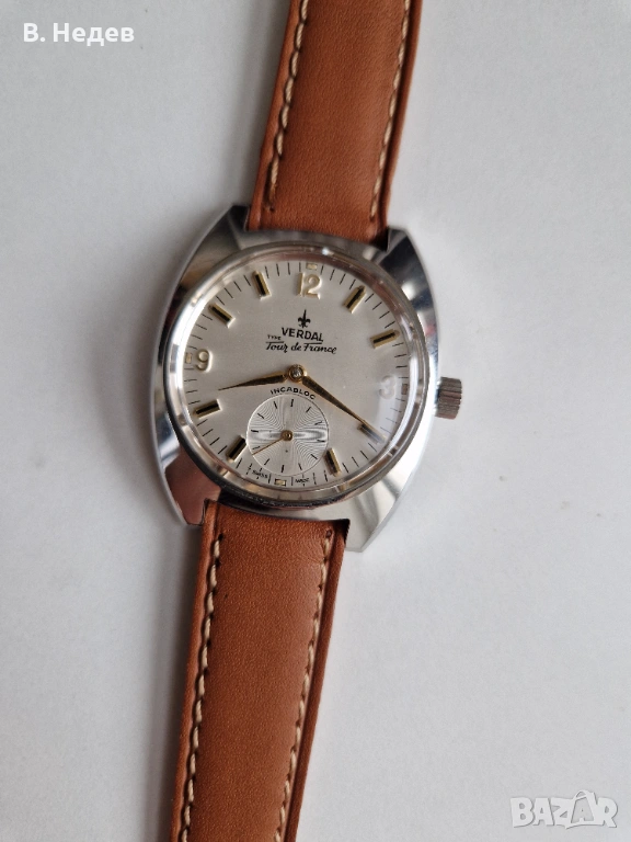 Продаваме този чисто нов, великолепен швейцарски часовник VERDAL Tour de France, 17 рубинови камъка, произведен в Швейцария; страхотен механизъм Unitas 6310N, истинска находка - часовника е нов, неносен - гарантирам! Производство в края на 70-те, стилен и елегантен - моля разгледайте снимките, без признаци на употреба. Абсолютно чист циферблат, незасегнат от годините; заслужава внимание касата - изцяло стоманена! Стрелки, индекси и надписи - идеално състояние. Отново се връщам на корпуса – стоманеният корпус практически е вечен. Маркировки с логото на марката - на ЦБ, коронката, капака на корпуса и на самото стъкло - има изображение на морско конче /видимо само с лупа/ в центъра на стъклото. Много добра работа на механизма, поддържа точно време, профилактиран преди седмица - профилактиката е само, защото дълги години е стоял, без да е ползван. Механизмът Unitas 6310N е т. нар. Wehrmachtswerk / Вермахтсверк; в категорията са: AS 1130, UT 6310, 6325, 6410, 6425 - великолепни механизми, които и в екстремни условия поддържат стабилна и устойчива работа и служат безпроблемно! Часовници с тези механизми са поръчвани за германската армия по време на ВСВ, както и дълги години в периода след това. Характеристики: ръчно навиване, малки секунди "на 6 часа"; 17 рубинови камъка, вибрации на баланса 21600 / ч, резерв на хода - 43-44 часа, механизмът работи абсолютно безпроблемно, навива се „мазно”. Фантастичен дрес часовник! Размери: 36мм, без коронката; от лъг до лъг - 42,5мм. Височина с куполното стъкло - 11,5 мм… Часовника се предлага със стоманена верижка + кожена каишка – св. кафява, чисто нова, доброо качество ... Благодаря за отделеното време!