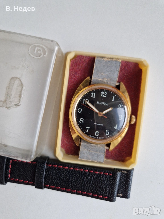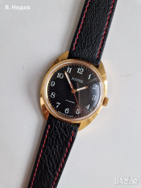 Продаваме този супер запазен руски /съветски/ часовник - нов! Ръчно навиване, отлично състояние - циферблат, цифри, стрелки, машина - супер състояние; моля разгледайте подробно снимките! ВОСТОК, 17 камней, сделано в СССР - изключителен часовник! Нормален мъжки размер на корпуса - диаметър 36,0 мм, без коронката. Здрав и надежден часовник с командирската машина. Външния вид на часовника се вижда на снимките, така, че ще опиша по-подробно машината - Кал. 2409 А, ръчно навиване, т. нар. "командирска" със 17 рубинови камъка, противоударен баланс /амортисьор на оста/; много безотказна и мн. надеждна; вибрации на баланса 19800/час; запас на хода - около 44-45 часа. Стандартната честота на вибрациите на баланса при винтидж часовниците е 18000/ч. Колкото по-високи са вибрациите на баланса, толкова по-малко се влияе точността на часовника от движението на ръката. Часовника е 100% автентичен! Позлатена каса, маркирана, 10 микр.!