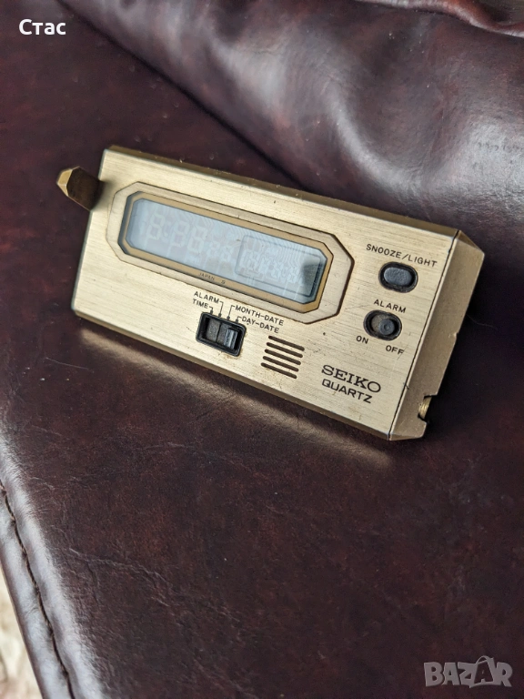 Рядък модел на Seiko,будилник с календар позлатен Японски,ще сложа батерия когато някой реши да го купи ,на пазара в чужбина на втора ръка струва от 120-180евро,зависи от състоянието му