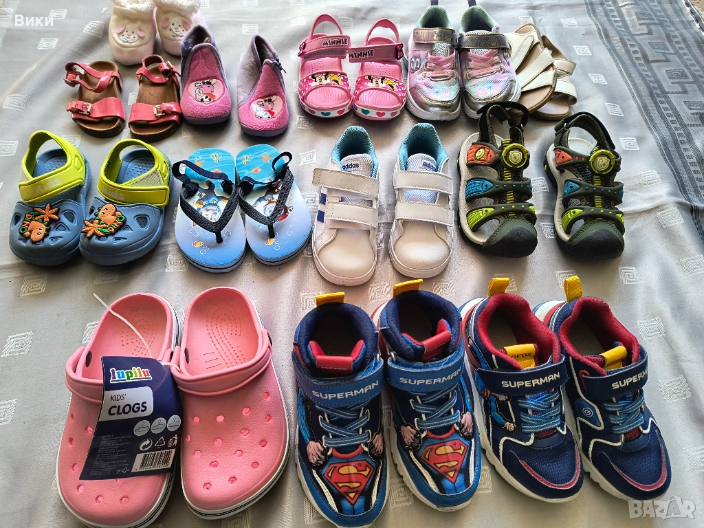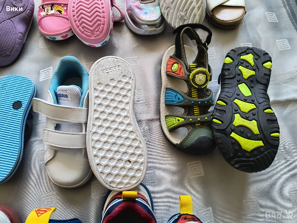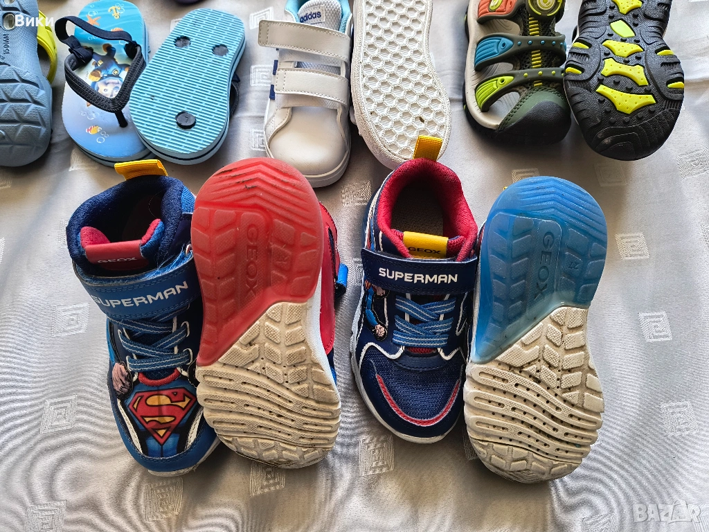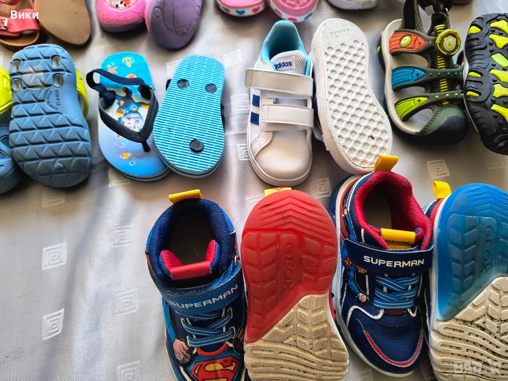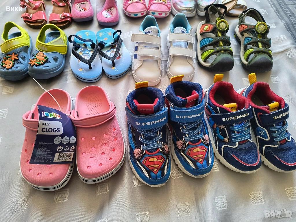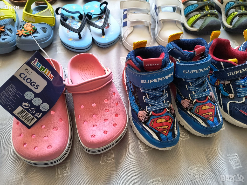 Марки и модели: Присъстват обувки от марки като Geox, Adidas, Crocs и Lupilu.