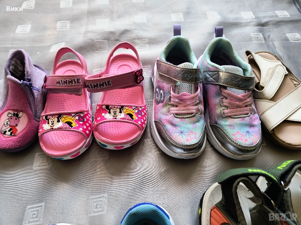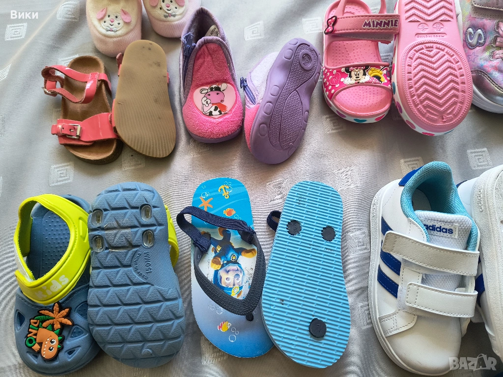 Други обувки: В горните редове се виждат сандали Minnie Mouse, бели кецове (вероятно Adidas) и различни летни сандали и джапанки.