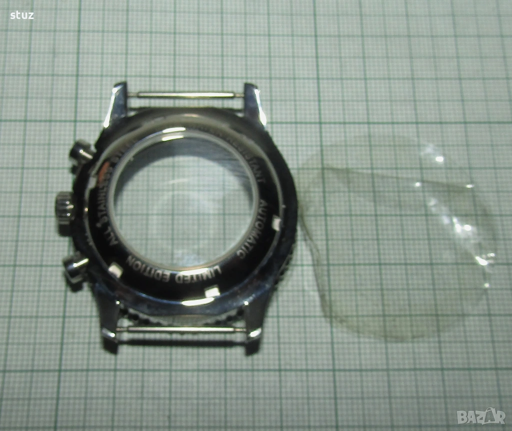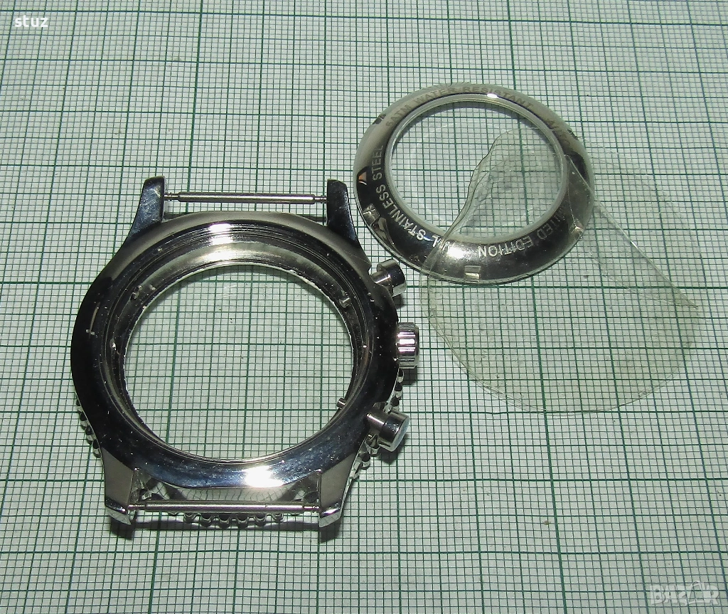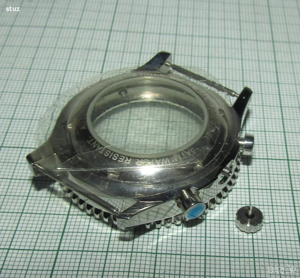 Касата е стоманена, нова, окомплектована с лицево кристално стъкло, заден капак също с кристално стъкло, бутони и коронка.