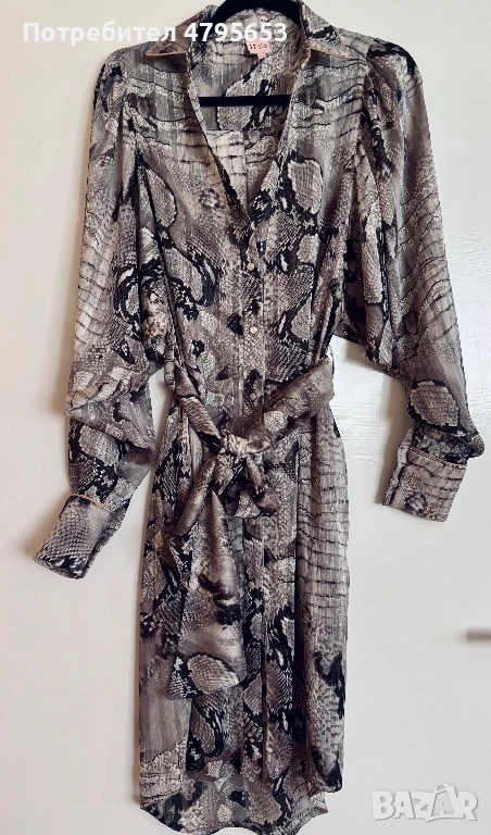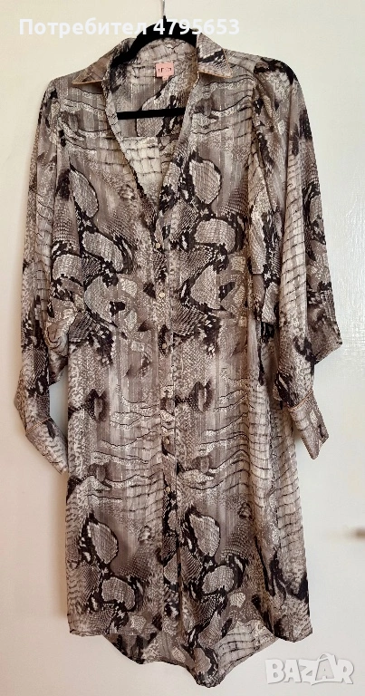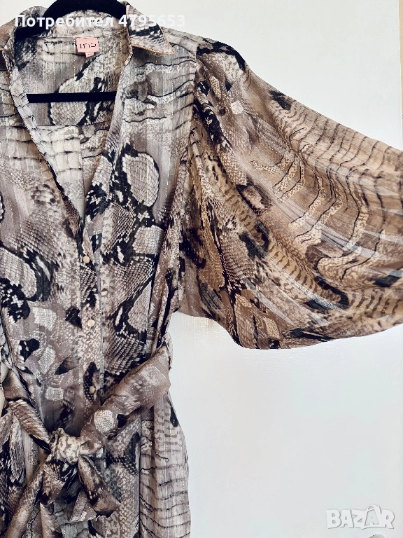 Разкошна рокля от дизайнерския български бранд Love By Iris, в безупречно състояние. Без никакви забележки. Обличана е веднъж за кратък повод. Ефирна, луксозна материя с леко лъскави нишки. Има разкошен ръкав тип пеперуда, с широк колан от същата материя и със златиста фуста на тънки презрамки. Пада много красиво. Размерът е XS, но предвид кройката ще стане и на дами с размер S и М. Подходяща както за специален повод, така и за ежедневно носене.