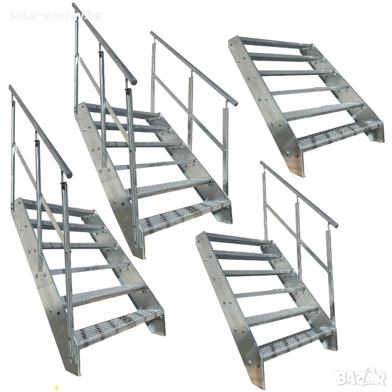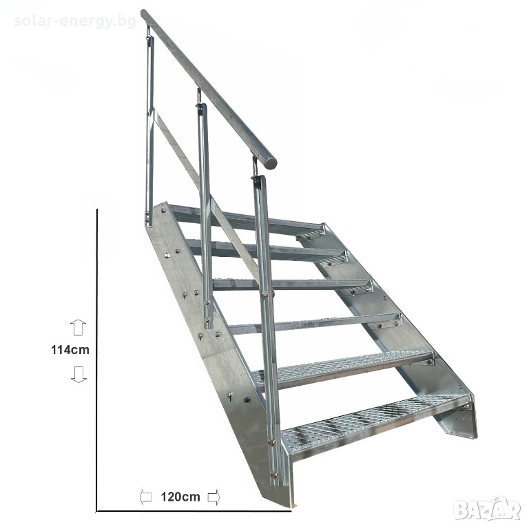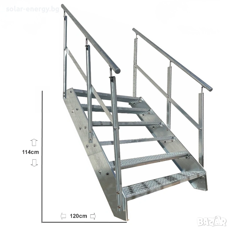 Стълбището е изработено от стомана с горещо поцинковане съгласно DIN EN ISO 1461, което осигурява дълготрайна защита от корозия и атмосферни влияния.