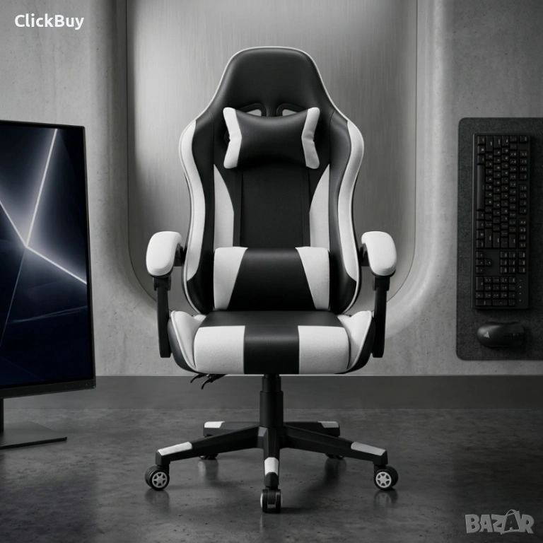 Ергономичен офис и геймърски бял стол – Максимален комфорт за гърба и врата, регулируем