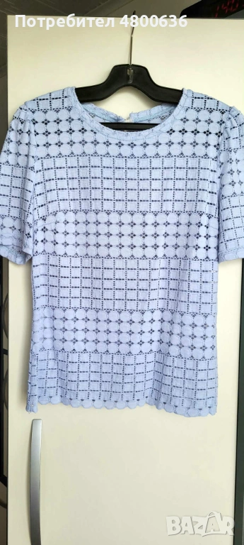 Блузата е от памучна дантела (тип рязана бродерия) в млечно-бебешко небесно син цвят. Има лека цепка на гърба и се закопчава с нежно копченце с илик. Носена е много малко, изключително запазена.