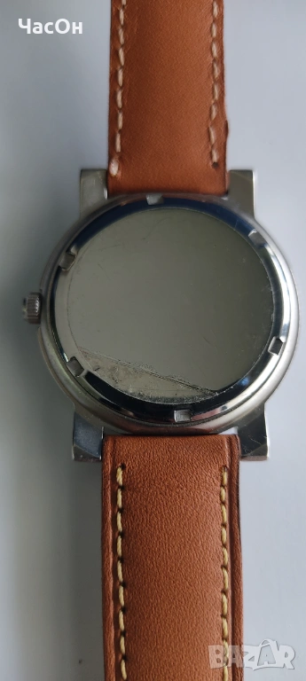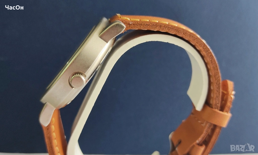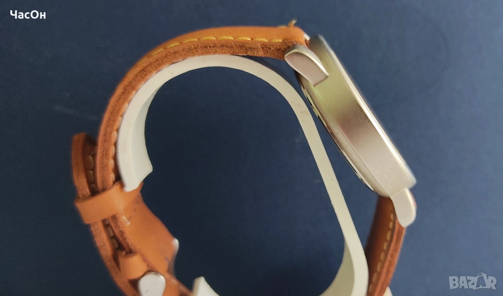 Часовникът е неизползван, с лепенка на капака, който не се затваря с щракване, а е на винт. Батерията е нова, швейцарска Renata, сменена съвсем скоро. Каишката е качествена, в жълтата гама в унисон с циферблата.