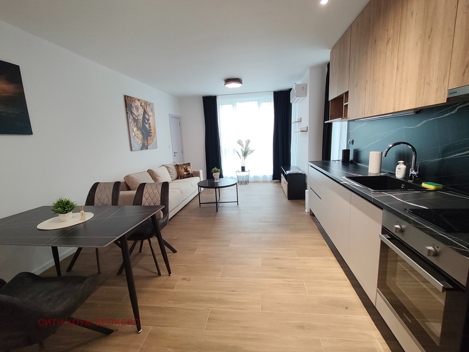 Районът предлага отлична комуникация и лесен достъп както до центъра на града, така и до Околовръстен път. В близост има квартални магазини за хранителни стоки, супермаркети, спирки на градски транспорт, училища и детски градини. Наоколо са построени няколко спортни площадки и игрища. Транспортната инфраструктура е силно развита, като най-близката спирка е на стотина метра разстояние. Състои се от дневна с кухненски бокс и трапезария, една самостоятелна стая, баня с тоалетна, складово помещение и две тераси. Обзаведен е напълно с абсолютно всичко необходимо за пълноценно обитаване висок клас мебели и електроуреди. Отоплението е посредством висок клас климатици. Има възможност за допълнително наемане на подземен гараж с топла връзка на цена от 100 евро.