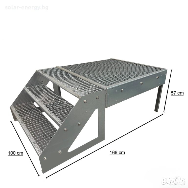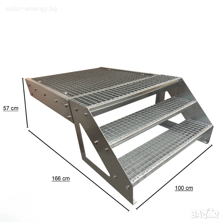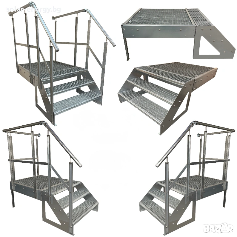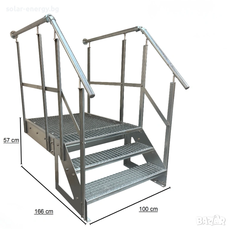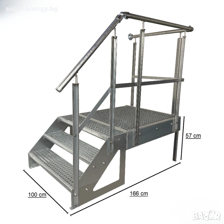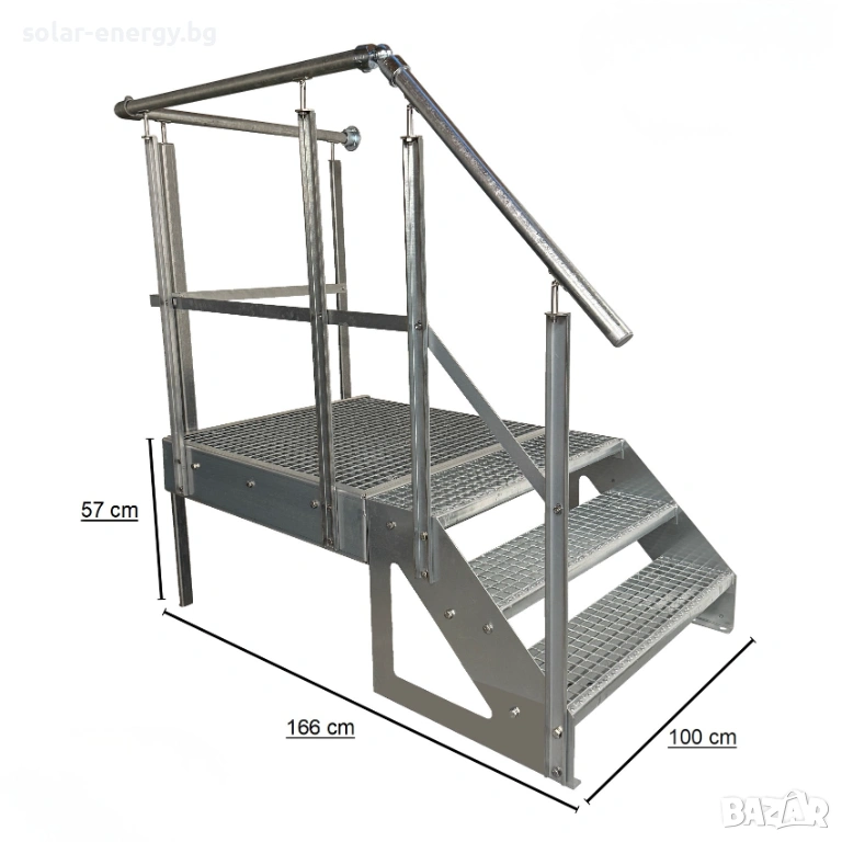 Предлагаме висококачествено метално стълбище с площадка и 3 стъпала, подходящо за външни и индустриални приложения.